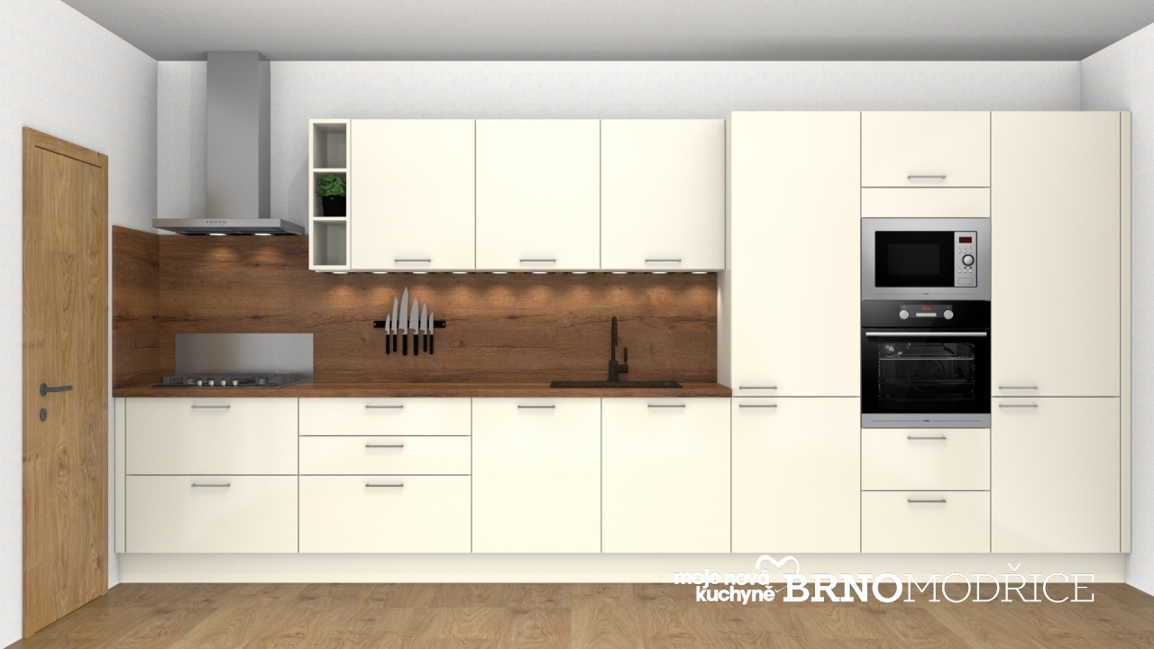 Lesklá Diana v dekoru magnolie a pracovní deska v hřejivém dřevodekoru Dub Koňak v lineární kuchyni.