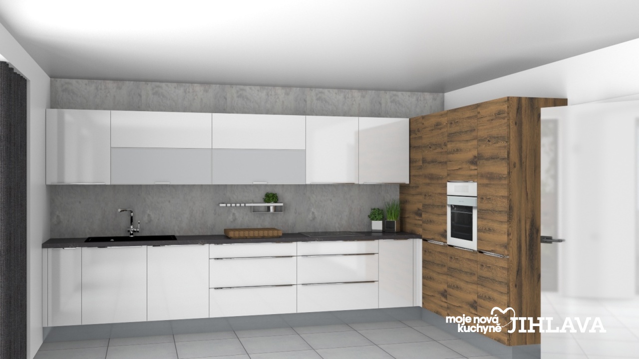 Luxusní lakovaná kuchyně Delta v bílém lesku, které dominuje výrazný dřevodekor modřín Montana.