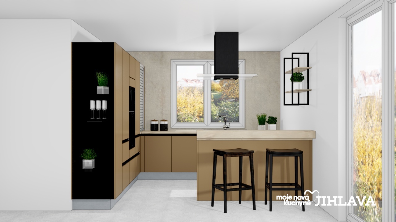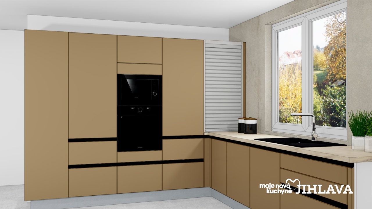Moderní kuchyně v lakovaném dekoru Gréta v luxusní zlaté barvě. Propojení s černou úchytkou Linea Piantra.