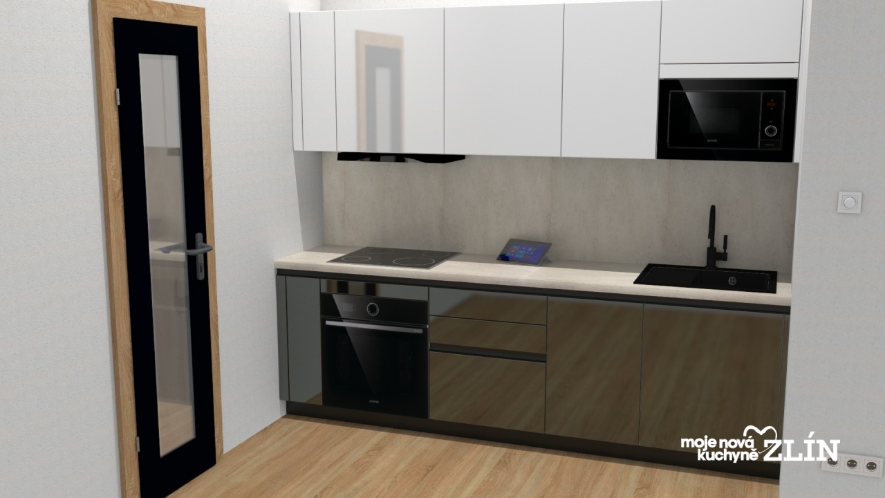 Malá rovná paneláková kuchyň Susann ve vysoké lesku v bílé a černé barvě.