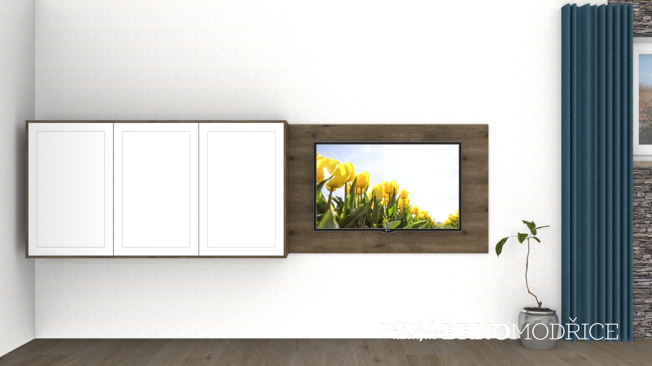Součástí návrhu je i obývací stěna, která je řešena ve stejných dekorech jako kuchyňská linka a jídelní stůl.