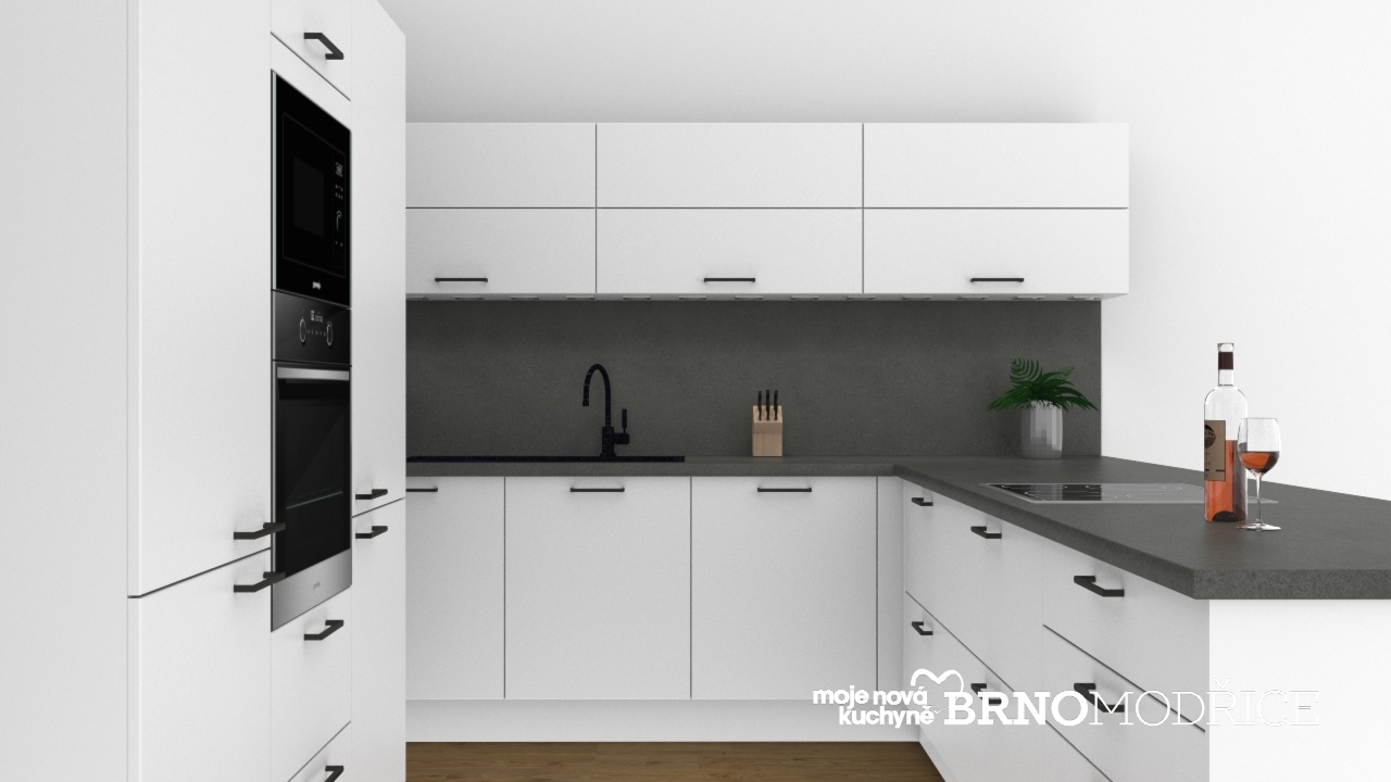 Klasická bílá kuchyň je zde oživena tmavě šedou pracovní a obkladovou deskou a kontrastními černými úchytkami, které ladí i s černým dřezem s baterii a spotřebiči.