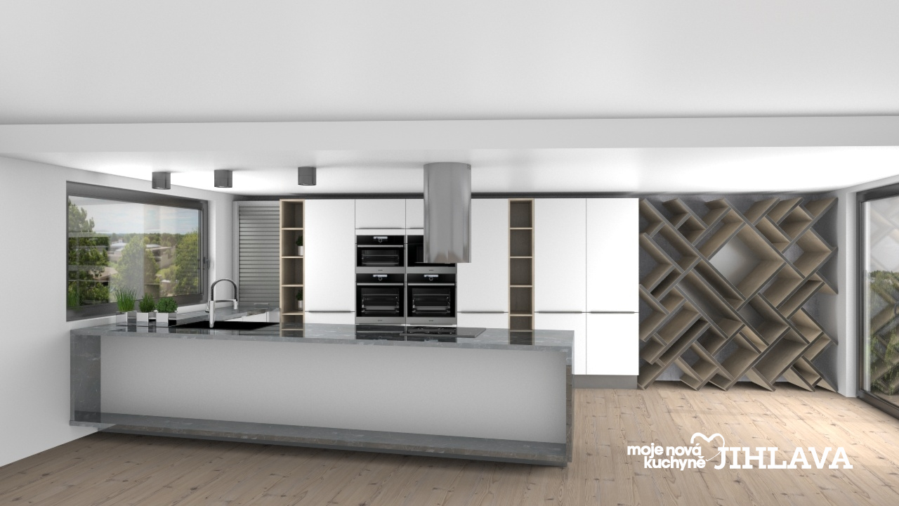 Na první pohled neobvyklé řešení ostrůvku navazujícího na stěnu. Pracovní deska probíhající i pod spodními skříněmi ještě více propojuje kuchyni v celek a dělá jí o to více luxusnější.Na celek kuchyně navazuje knihovna propojená materiálově s otevřenými regály, zastupujícími odlehčující prvek a úložiště kuchařek, dekorací či vína.