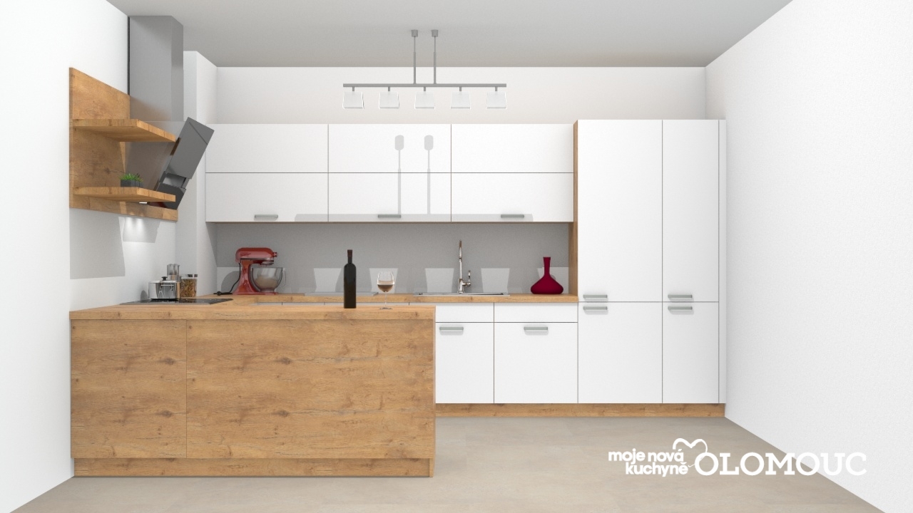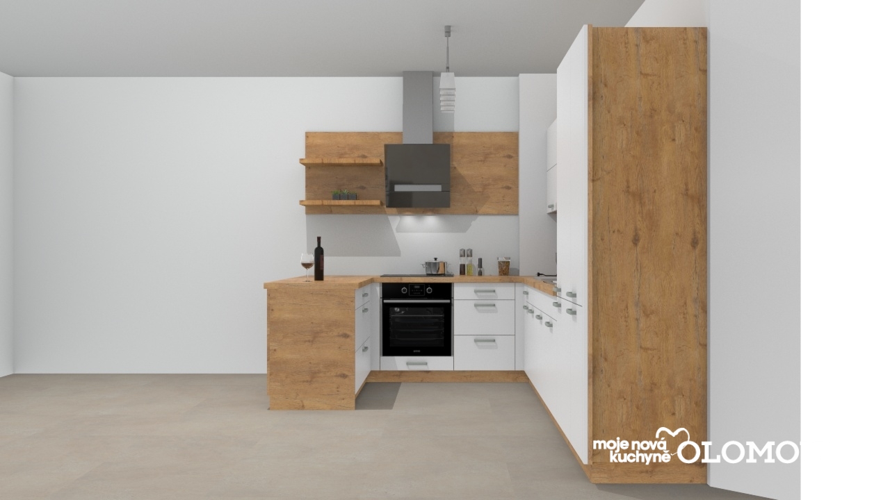 Moderní kuchyň ve tvaru U s velkým úložným prostorem, v matné bílé barvě v kombinaci výrazného dřeva dub antik. Horní skříňky jsou lomené, výklopné nabízející dostatek úložného prostoru. Otevírání skříněk zajišťuje širší a zaoblená úchytka v barvě nerezu. V sestavě vysokých skříní je i 40 cm široká potravinová skříň s vnitřními výsuvy a vestavná lednice. Spodní roh je vyřešen rohovou skříňkou s policí a zásuvkou. U varné desky s troubou je 50 cm široká zásuvka se dvěma hlubokými výsuvy. To vše zakončuje ostrůvek, který současně odděluje kuchyň od další místnosti, z jeho vnitřní strany je 120 cm široká zásuvka s hlubokými výsuvy. Z vnější strany ostrůvku je zakomponovaná klasická otevírací skříň s policemi. Zkosený odsavač par 60 cm široký designově doplňující sestavu kuchyně, který je také velice praktický. Zádový obklad za odsavačem je v dekoru pracovní desky v dubového dřeva.