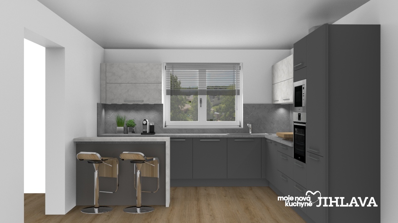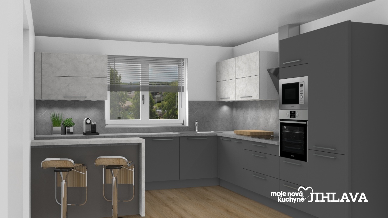 Matná Ella v tmavě šedém odstínu na spodních skříních v kombinace s bílým betonem Celine na horních skříních a barové desce.