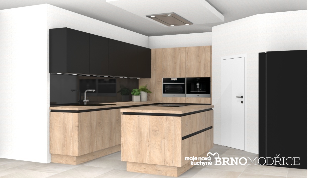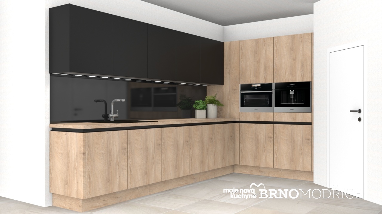 Kuchyň je v bezúchytkové variantě s černou lištou Linea Piantra.