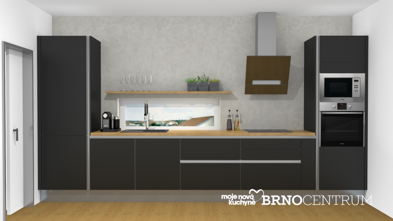 Výrazným designovým prvkem kuchyně je zkosený odsavač par gorenje.