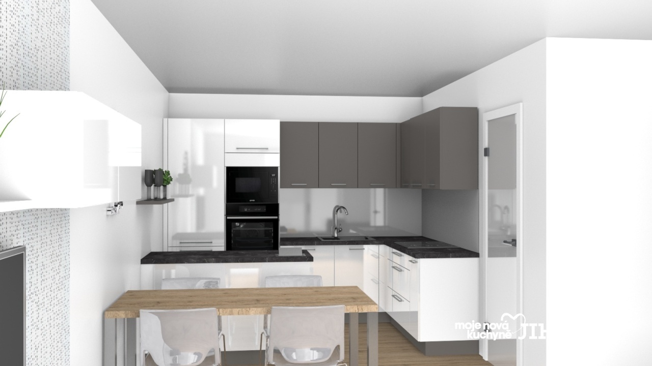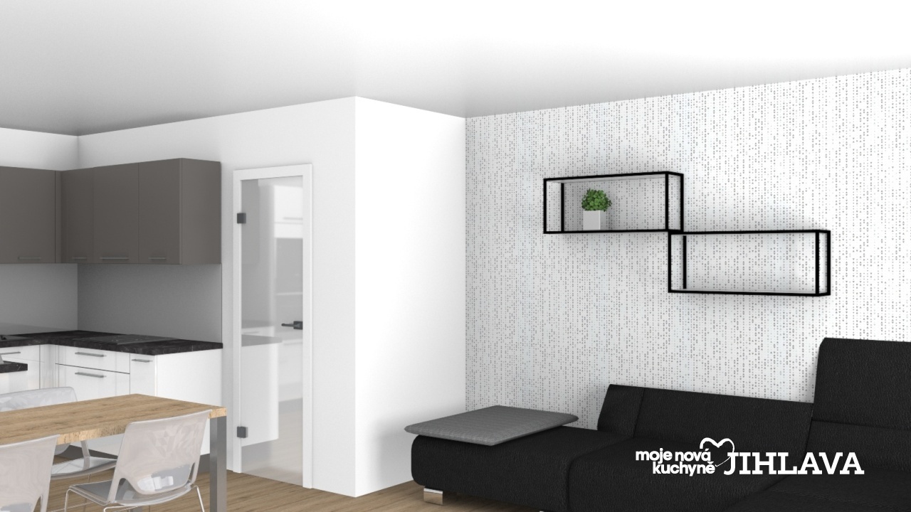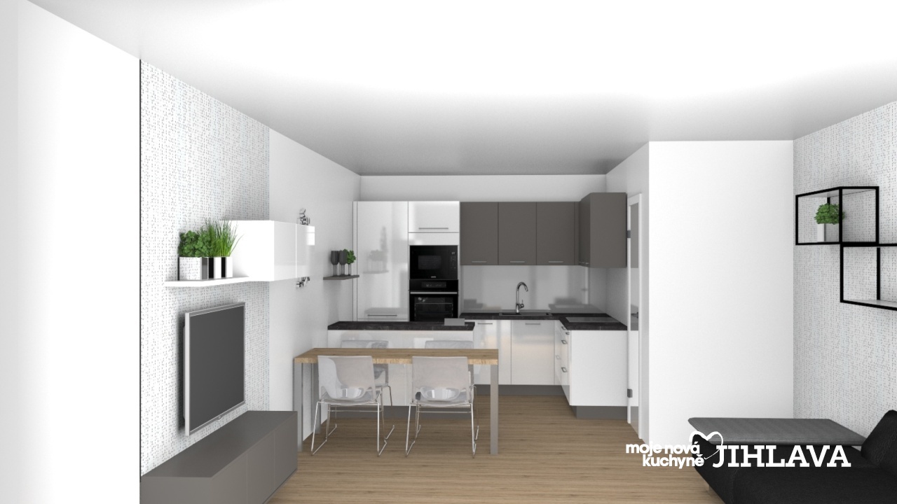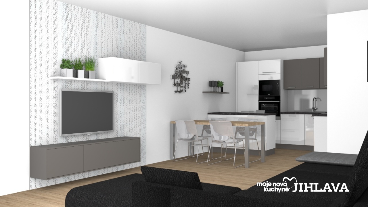 Klientka chtěla nejdříve návrh pouze kuchyňské linky, nabídla jsem jí ale navržení celého prostoru ve kterém je součástí jídelní kout a v pozadí i obývací část.
