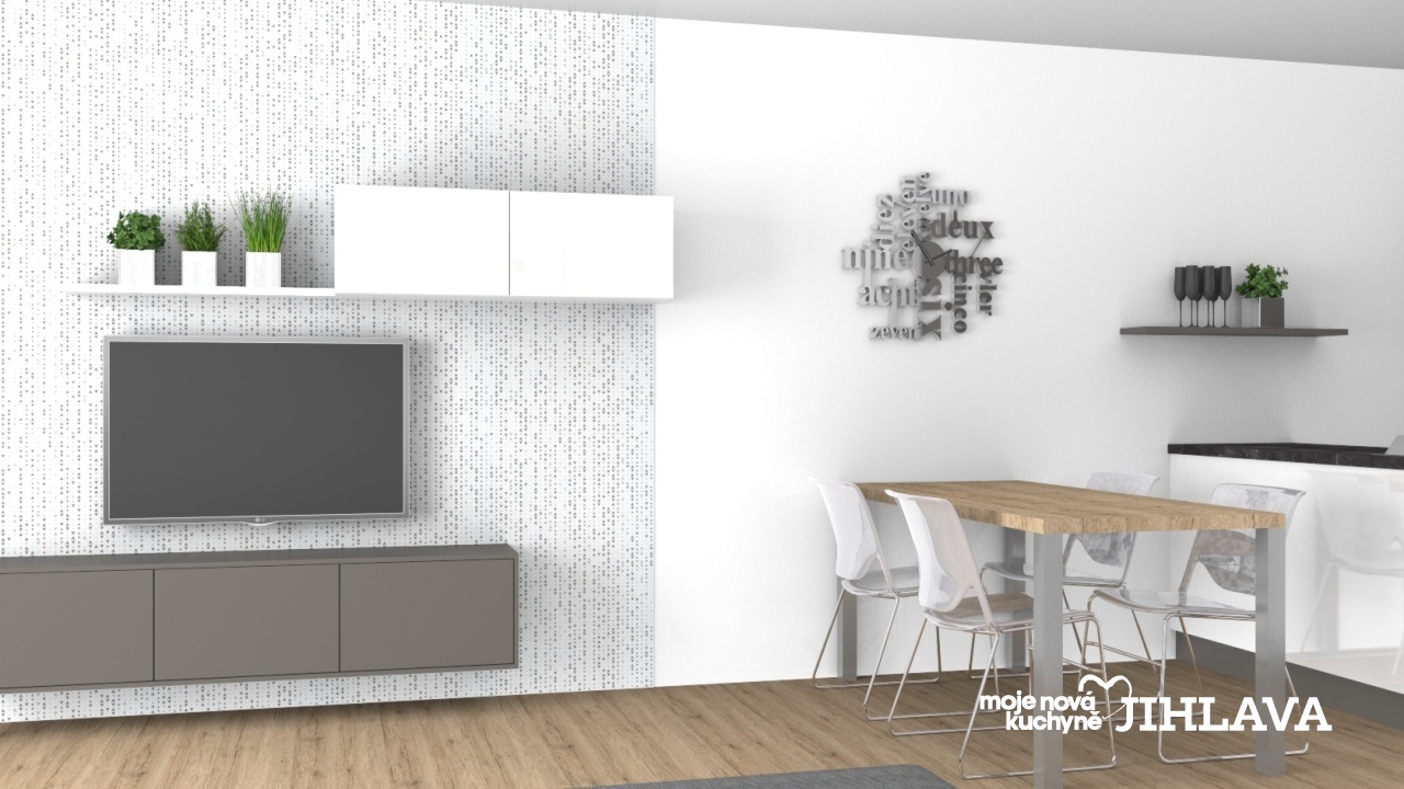 Celý interiér je laděný do studených tónu v podání bílé lesklé kuchyně Susann, doplněný o šedou matnou barvu a dřevo dekor, který je použit na podlaze a na jídelním stole.