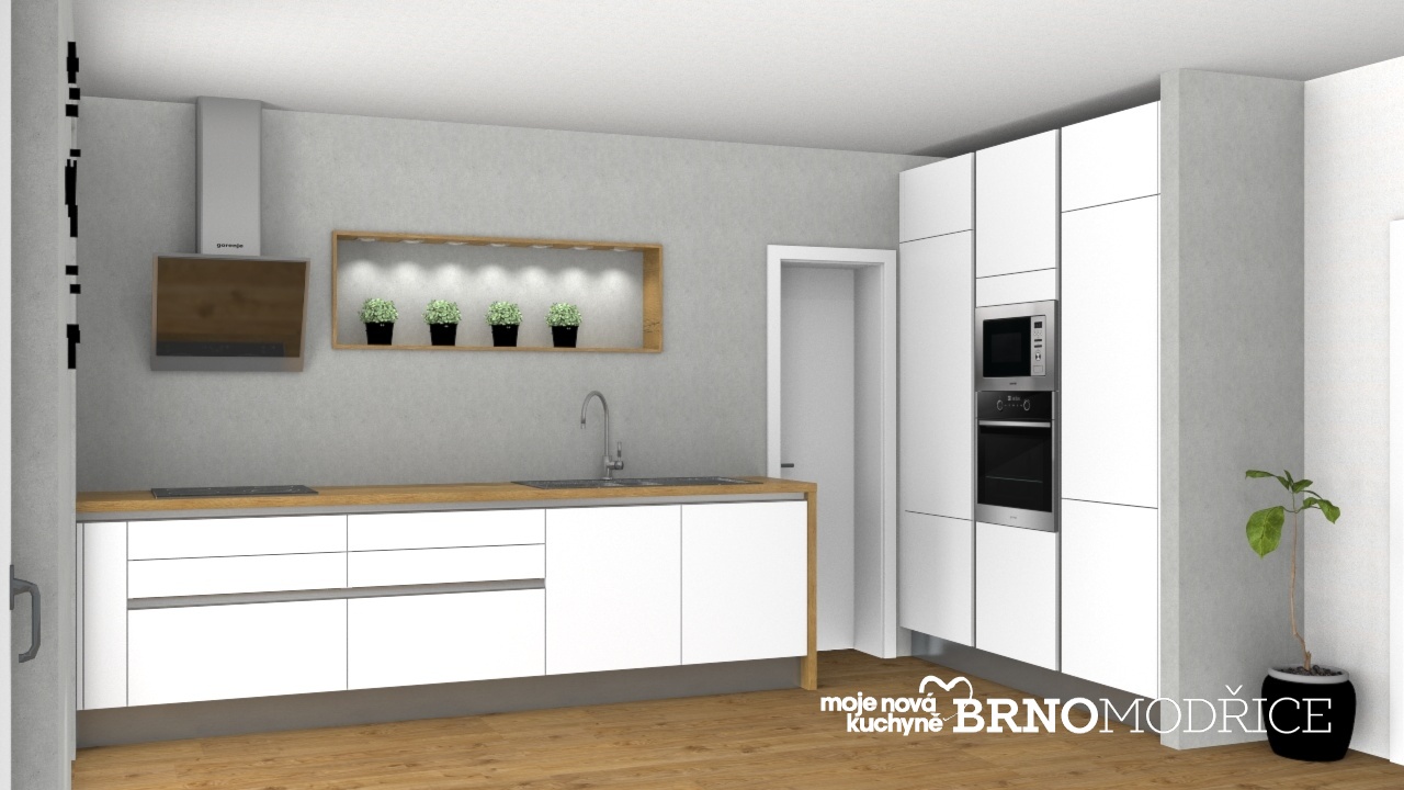 Pro zachování vzdušnosti interiéru nejsou použity žádné horní skříně, ale pouze je zde řešena nika ve stěně, která je orámovaná deskami v dekoru dřeva a osvětlená.