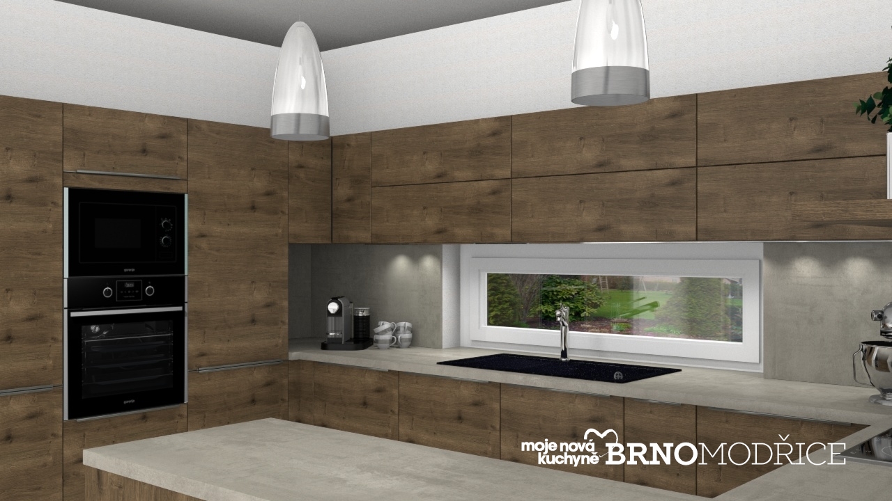Pracovní deska je zde protažena do parapetu okna a okno vychází mezi pracovní desku a horní skříňky.