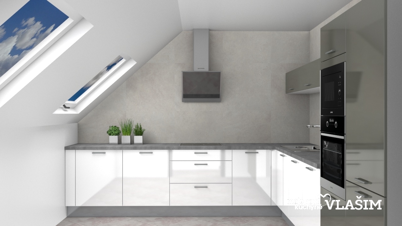 Klasická kuchyňská linka do tvaru L pro maximální využití pracovní plochy. Kuchyň v provedení lesklé Susann v kombinaci dekoru bílá a šedé quards. Pracovní deska polyform v dekoru retro blue vytváří společně s obkladovým panelem stejného dekoru tmavou linii, která se skvěle hodí k této kuchyni. Součástí linky je výsuvný sorter na odpadky umístěný pod dřezem a příborník umístěný v horním šuplíku pod varnou deskou. Vzhledem k sešikmení stropu v dispozici kuchyně jsou použity horní skřínky jenom na jedné stěně.