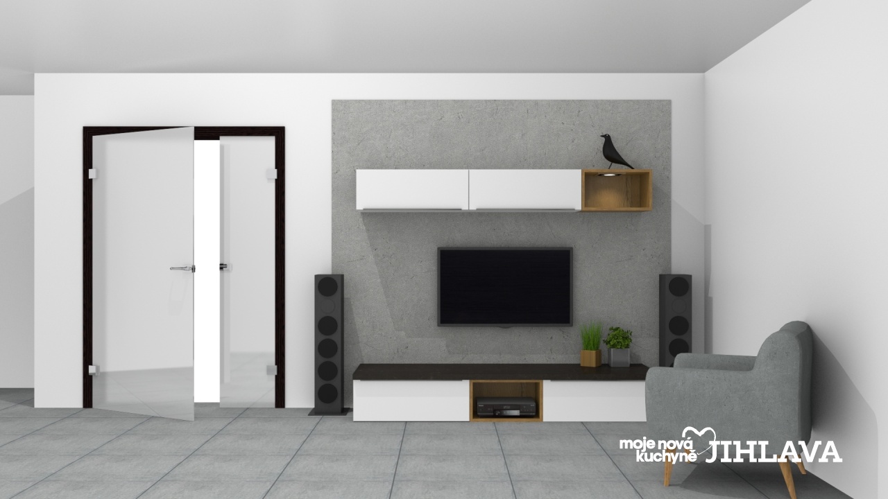 Moderní obývací stěna v kombinaci lesklé bílé Susann s dřevodekorem Cora Dub divoký, který je použit na otevřené police.