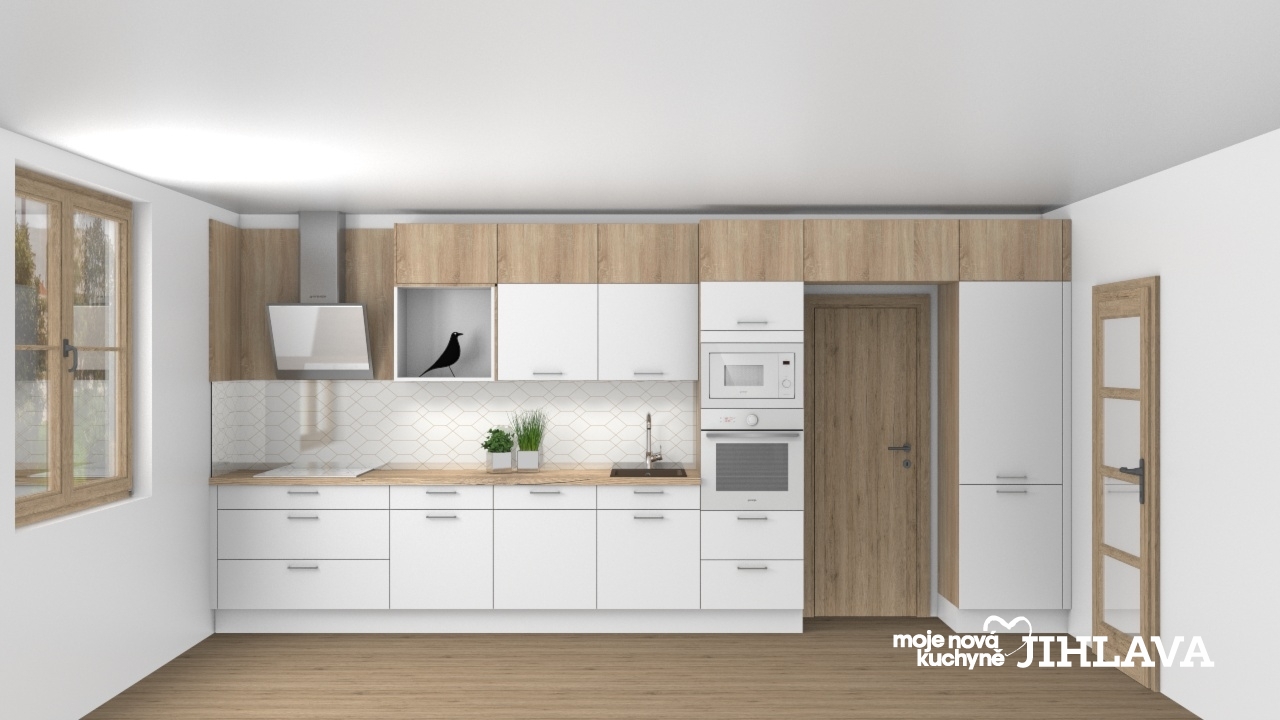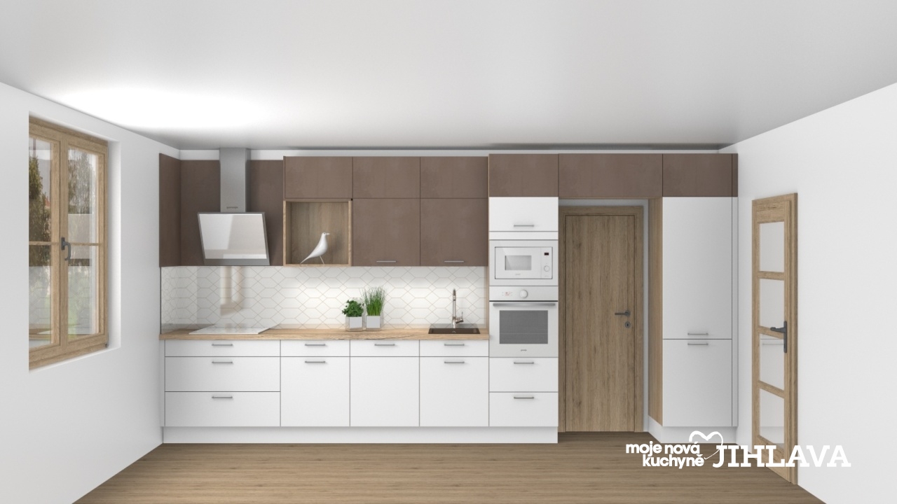 Představa investora byla více méně jasná, rovná linka, „spodní a horní skříňky a určitě ta vestavná trouba ve výšce“, což v tomto prostoru bylo zcela nereálné kvůli dveřím z chodby, které zabírají na stěně místo, pracovní deska kuchyně by byla tak nedostačující, proto byla klientovi navržena možnost “ obestavby“ vstupních dveří z chodby. Celková kuchyně je laděná do zemitých odstínu, ve spodní části použit materiál Ella – bílý hedvábný mat, na horních skříňkách dekor Celine – Kupferbronze .Na pracovní desce a korpusu skříní je použit dřevo dekor Dub Sonoma, dokonale tak zapadne k laminátové podlaze a stávajícím dveřím. Za kuchyňskou linkou se nachází grafosklo s jednoduchou zlatou grafikou v podobě ornamentů. Vedle dveří po pravé straně se nachází vestavná chladnička s mrazákem, nad dveřmi úložný prostor v podobě výklopné skříně se systémem Push-pull a na ní navazuje panel s multifunkční troubou a vestavnou mikrovlnnou troubou ve výšce Na tuto sestavu pak navazuje linka se spodními výsuvy, myčkou a dřezovou skříní.