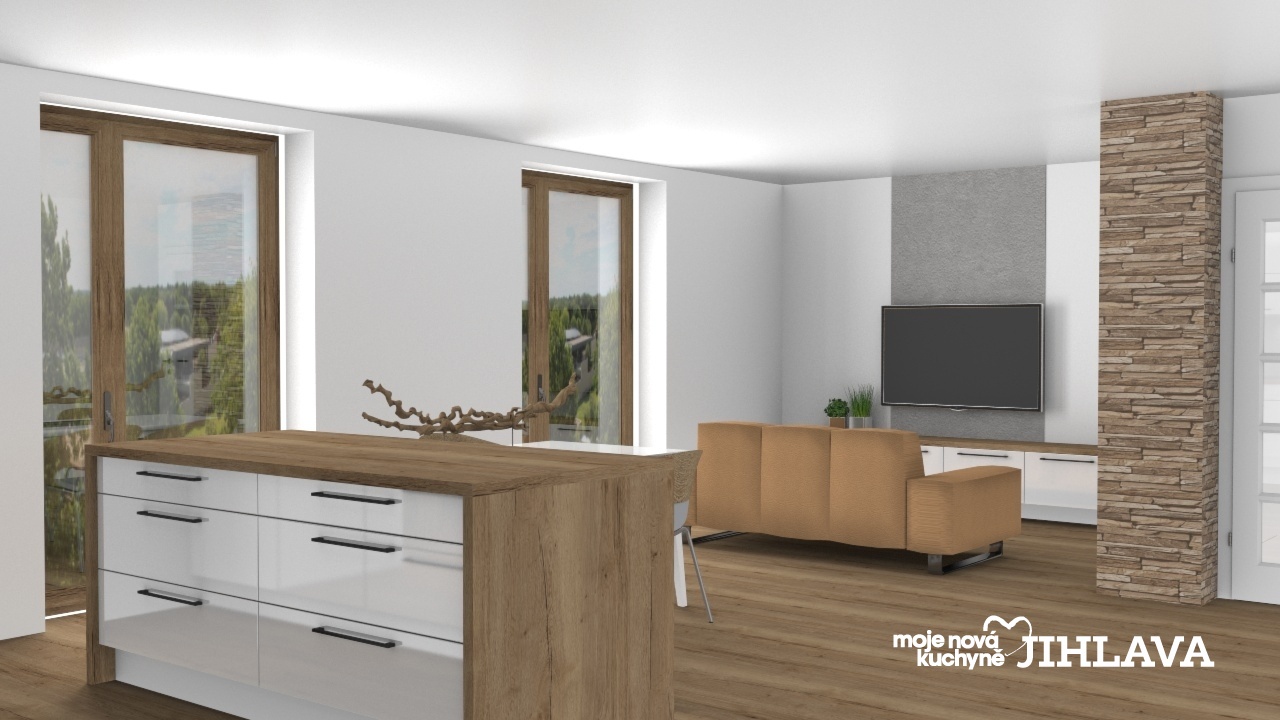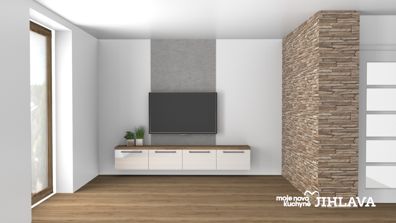 Součást návrhu je i jednoduchá obývací sestava se spodními skříněmi a dřevěnou deskou.