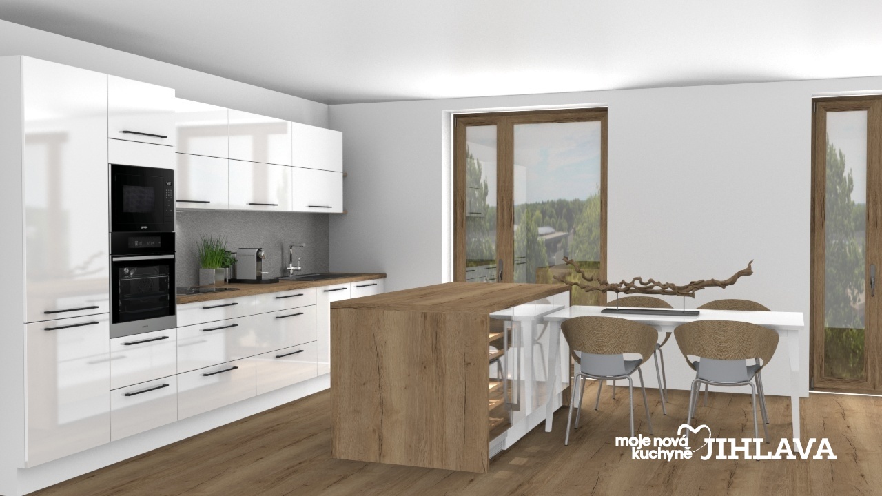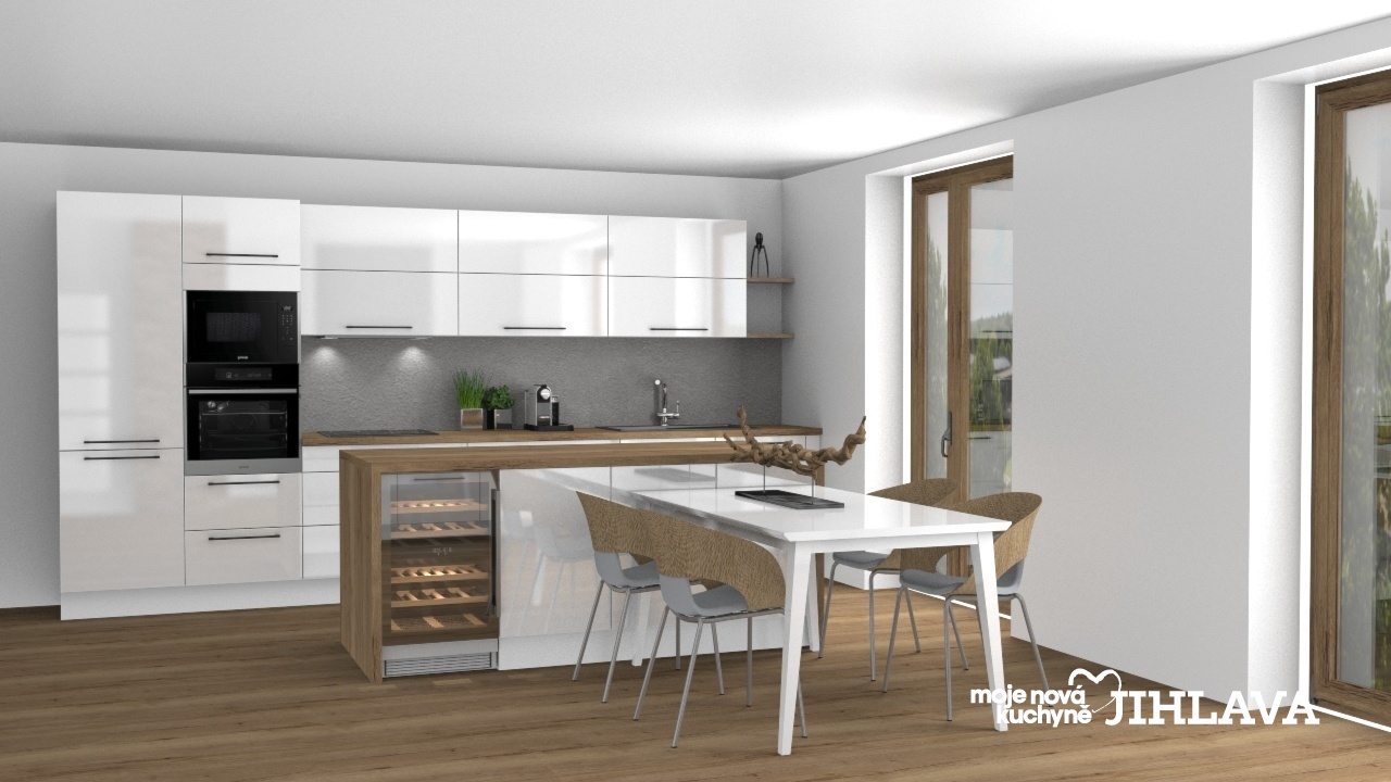 Varná a mycí zóna je situovaná u stěny spolu s vysokými skříněmi, vestavná chladnička a panel s dotykovou mikrovlnnou troubou a troubou o objemu 71 l.