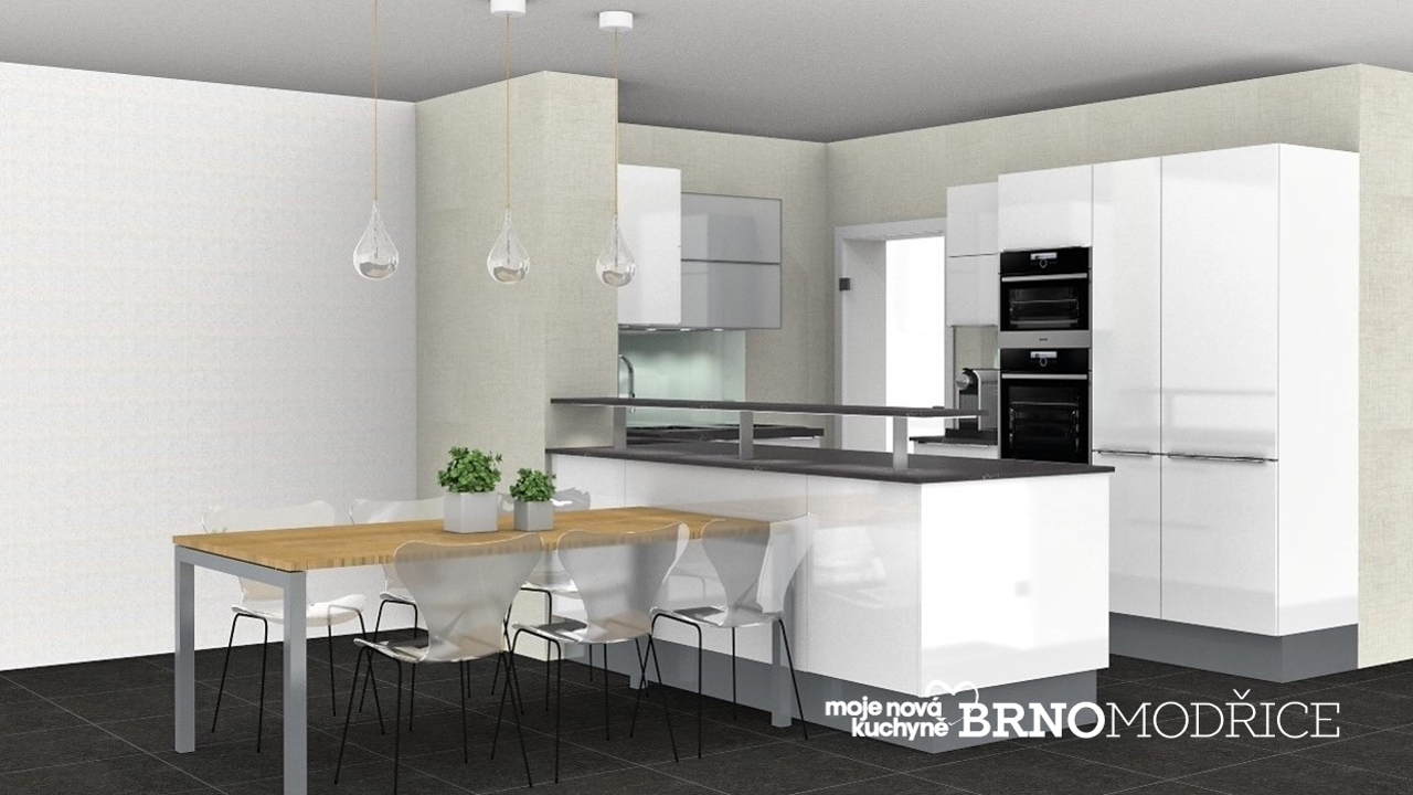 Praktická vysoká skříň s moderní parní a kombinovanou troubou. Vestavěná myčka energetické spotřeby A+++ a invertorovou technologií PowerDrive, vestavná kombinovaná chladnička. Osvětlení LED přisazenými profily na dálkové ovládání. Výklopný zásuvkový port v pracovní desce k připojení externích spotřebičů.