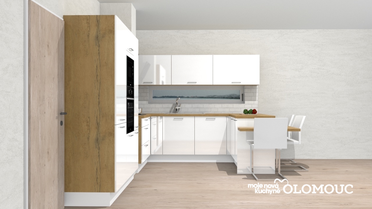 Klasická matná bílá kuchyně s pracovní deskou v dekoru dub divoký je nestárnoucí klasikou, která se neokouká. K téhle je navíc z praktických důvodů připojen i jídelní stůl, takže celá sestava působí kompaktně a nezabírá více prostoru, než je potřeba. Jako obkladový panel je zvoleno sklo s grafickým dekorem. V sestavě vysokých skříní je i potravinová skříň, rohové úložné prostory jsou řešeny karuselovou skříňkou a skříňkou s ledvinami, díky kterým je rohový prostor plně využit.