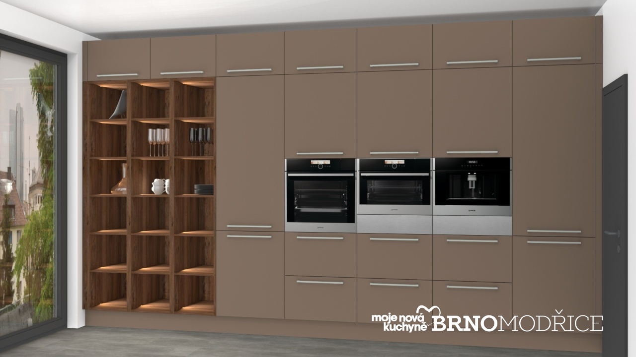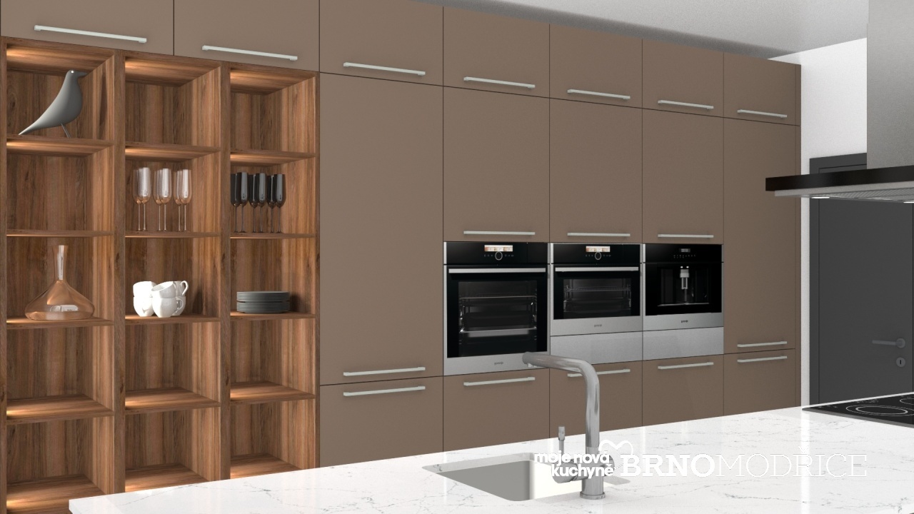 V této kuchyni je použito to nejlepší a nejsofistikovanější co gorenje nabízí. Kávovar, dvě ohřevné zásuvky, parní kompaktní trouba a multifunkční trouba. Monoklimatická chladnička a mraznička, myčka, indukční varná deska a ostrůvkový odsavač.