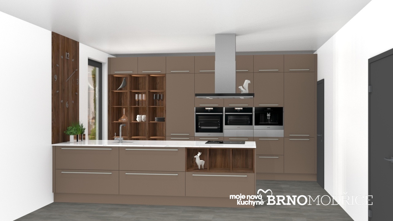Obrovská luxusní kuchyně Selena z matného hnědošedého akrylu v kombinaci s tabákovým ořechem.