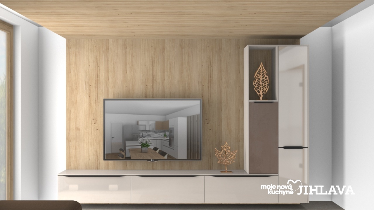 Spodní závěsné skříňky pod televizi rozdělené na 3 části, na které navazují na pravém konci vysoké skříňky.