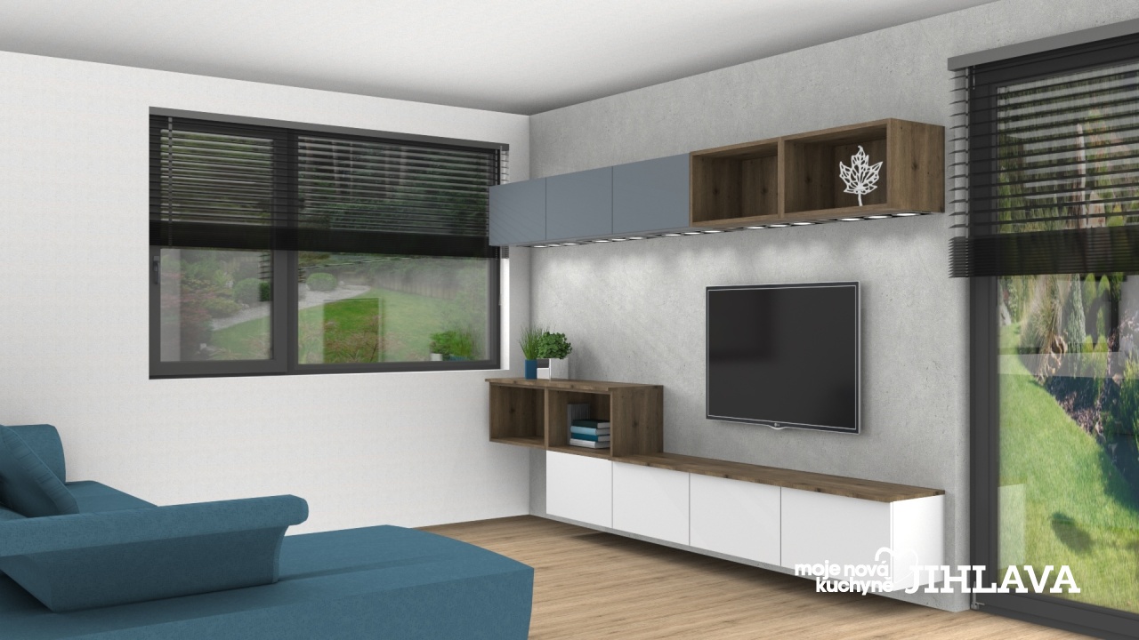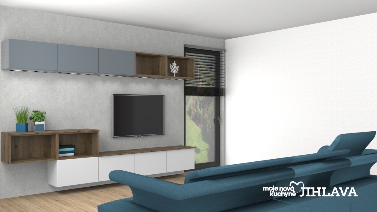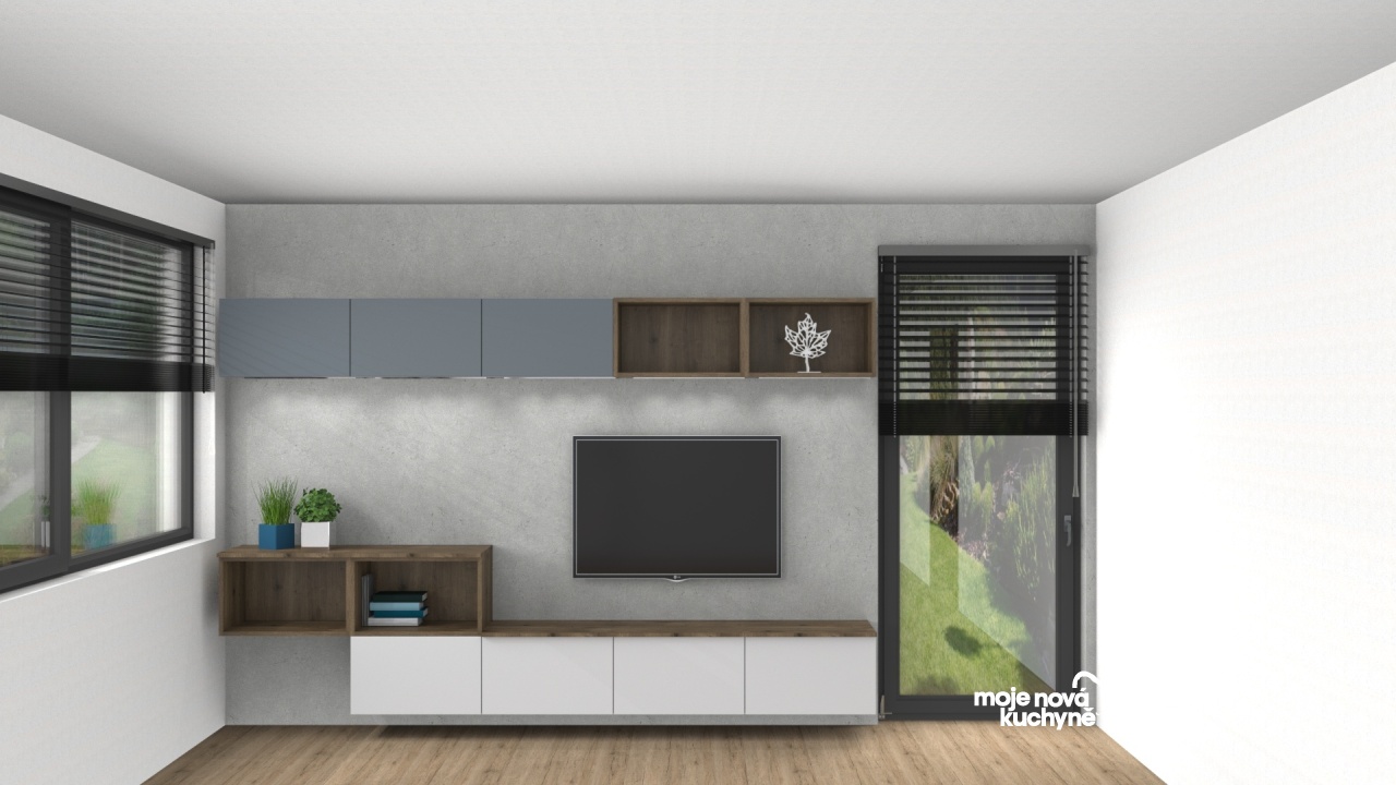 Otevřené niky a deska na spodních skříňkách je v dekoru dub Terra. Tato dispozice poskytuje úložný prostor a otevřené niky slouží například jako knihovna.