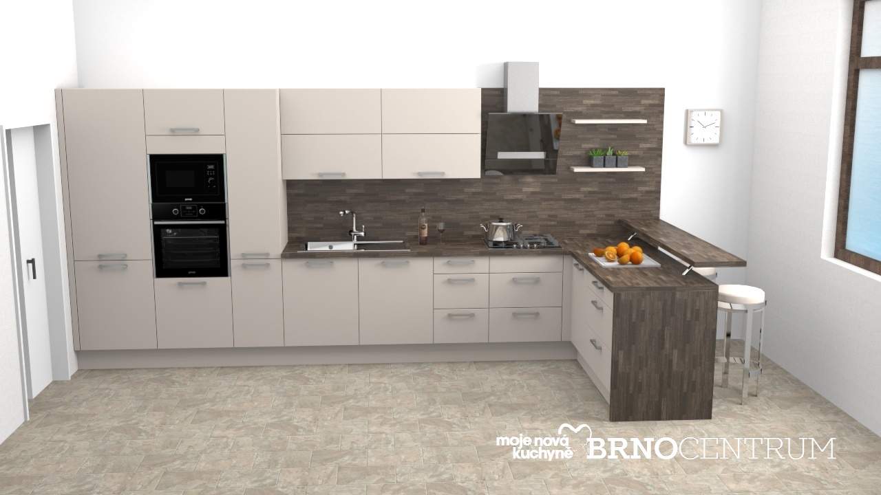 Jedná se o sestavu skládající se z bloku s vysokými skříněmi pro integrovanou lednici, troubou, mikrovlnnou troubu a zároveň i potravinovou skříní, na kterou navazuje linka s poloostrůvkem a barovou deskou na šikmých konzolách.