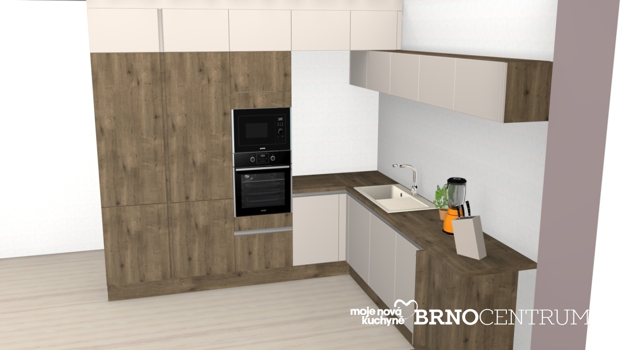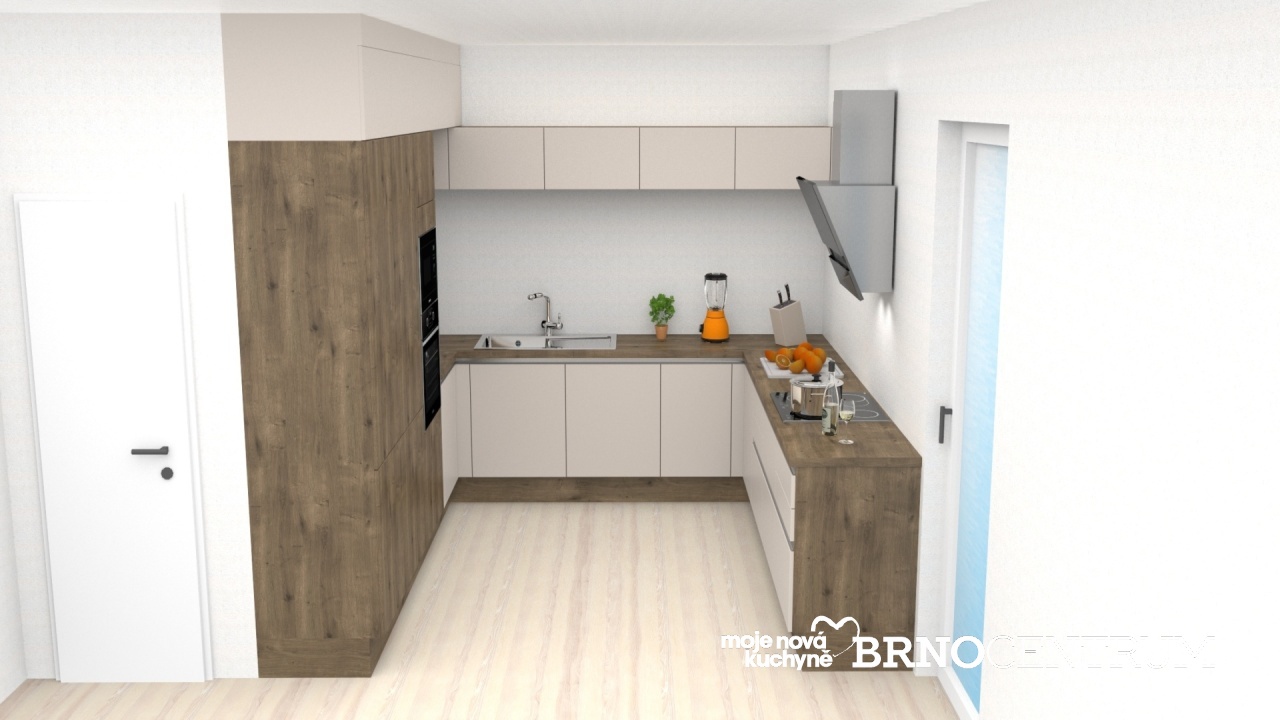 Moderní kuchyně Ella v matném pískově béžovém laku v kombinaci s Corou v dřevodekoru Dub Terra, který je použit i na pracovní desku a sokl.