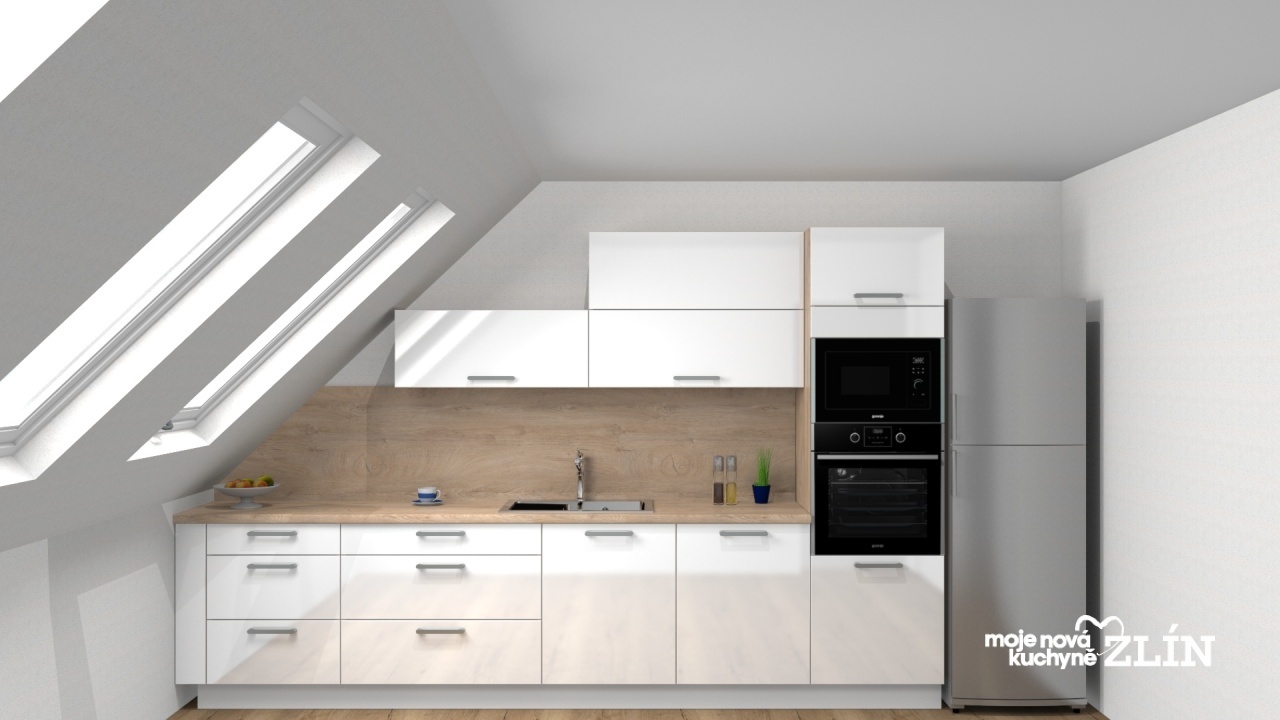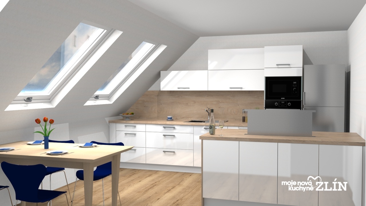Podkrovní kuchyně v dekoru Laila lakovaná bílá s pracovní deskou a zádovým obkladem v dekoru obilí světlé pro hřejivější pocit.