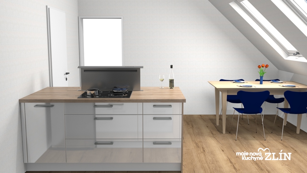 Dominancí této kuchyně je ale ostrůvek s varnou deskou a vestavnou, výsuvnou digestoří z pracovní desky.  Zezadu ostrůvku jsou přidány další skříňky s poličkami, pro další úložný prostor.