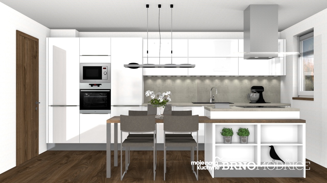 Dispoziční řešení kuchyně je lineární s ostrůvkem a integrovaným jídelním stolem.