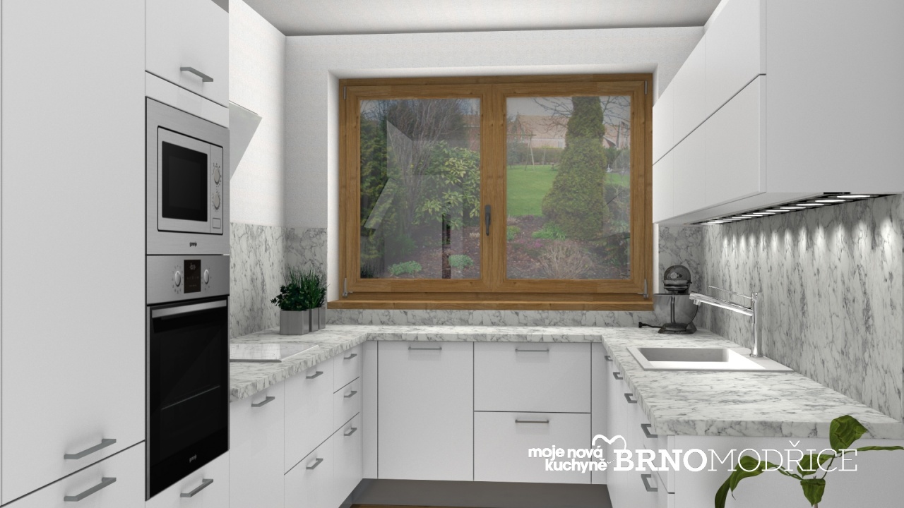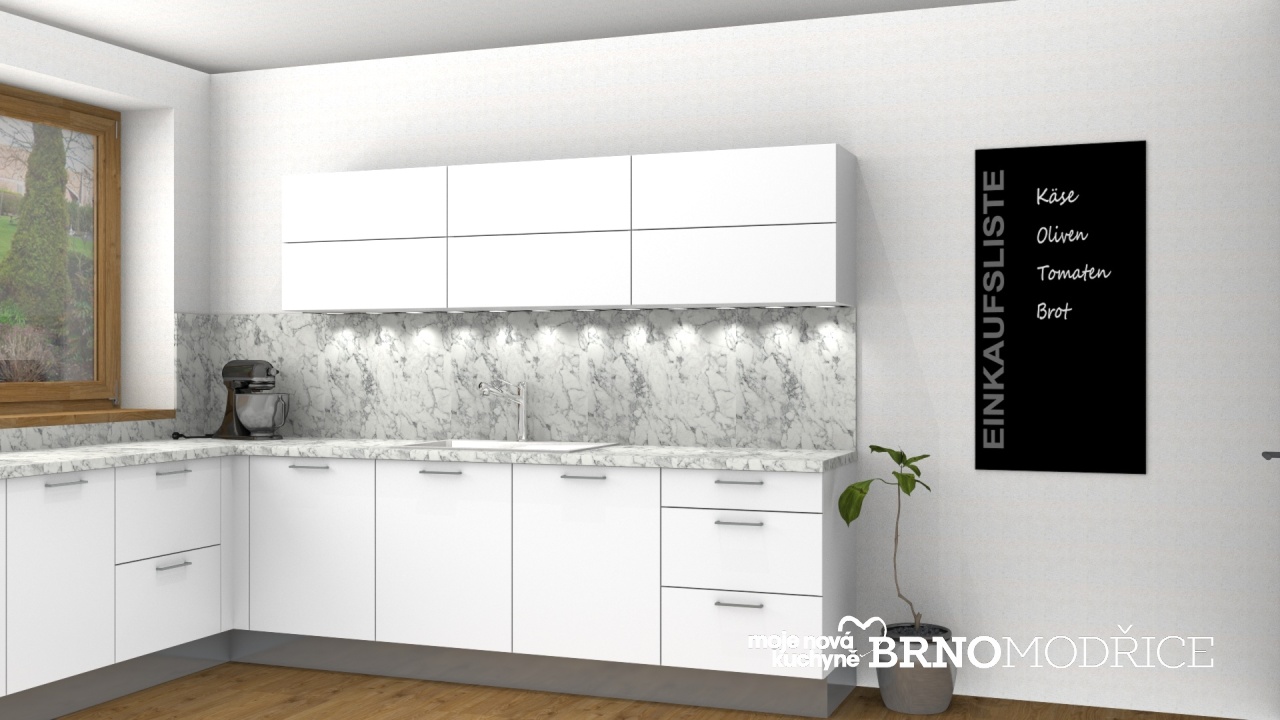 Pracovní deska je v dekoru Mramoru Bílého, který je zvolen také na zádový obklad.