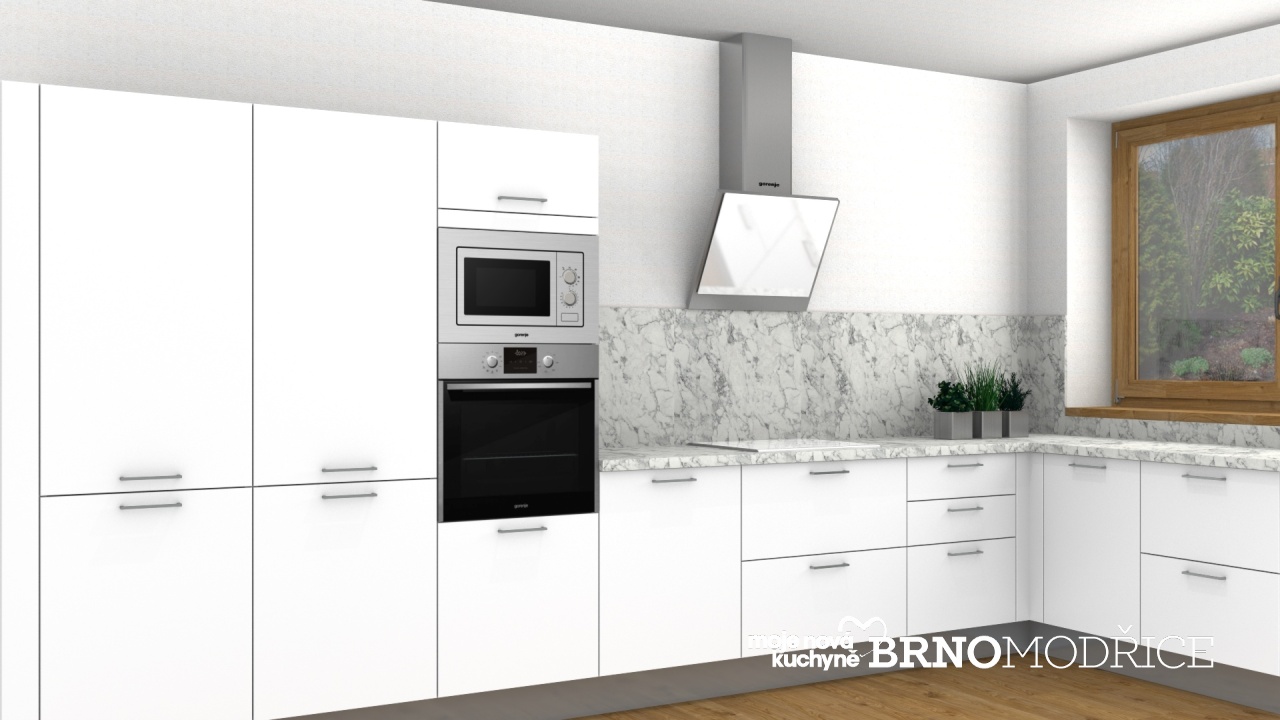 Monoklimatická chladnička, podstavná mraznička, horkovzdušná trouba, vestavná mikrovlnná trouba, indukční varná deska, komínová digestoř a plně integrovaná myčka značky gorenje.
