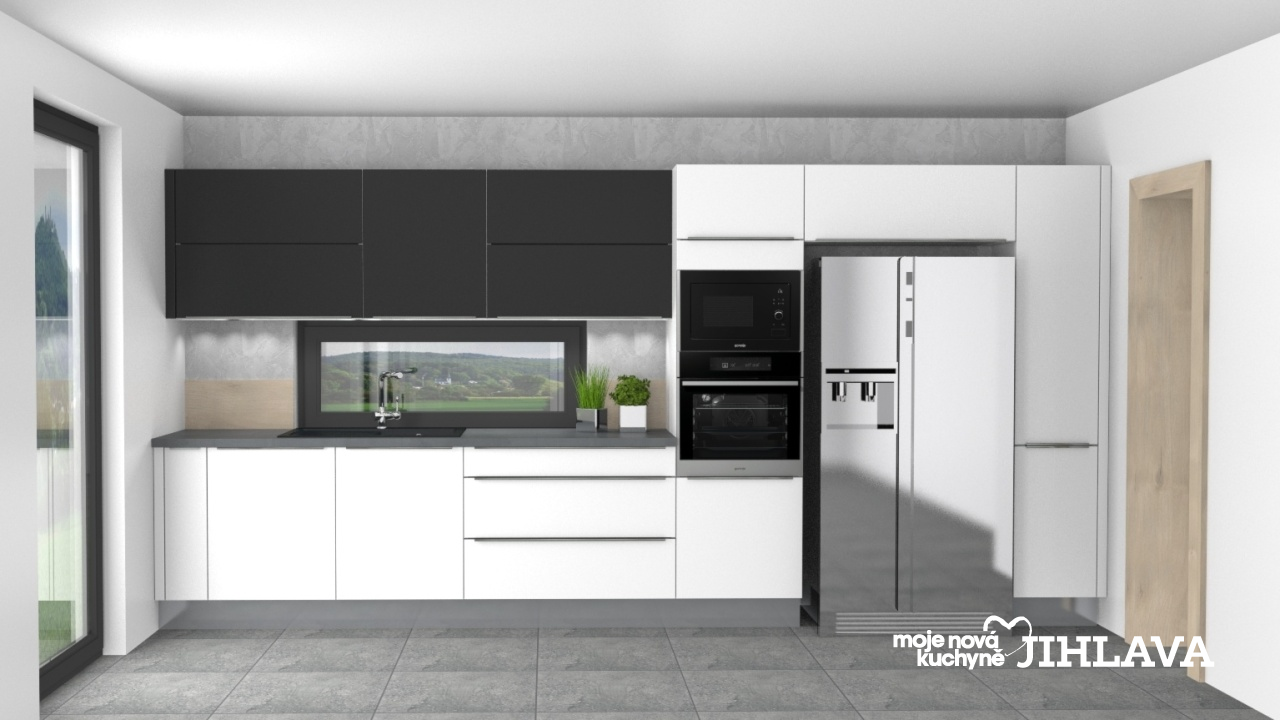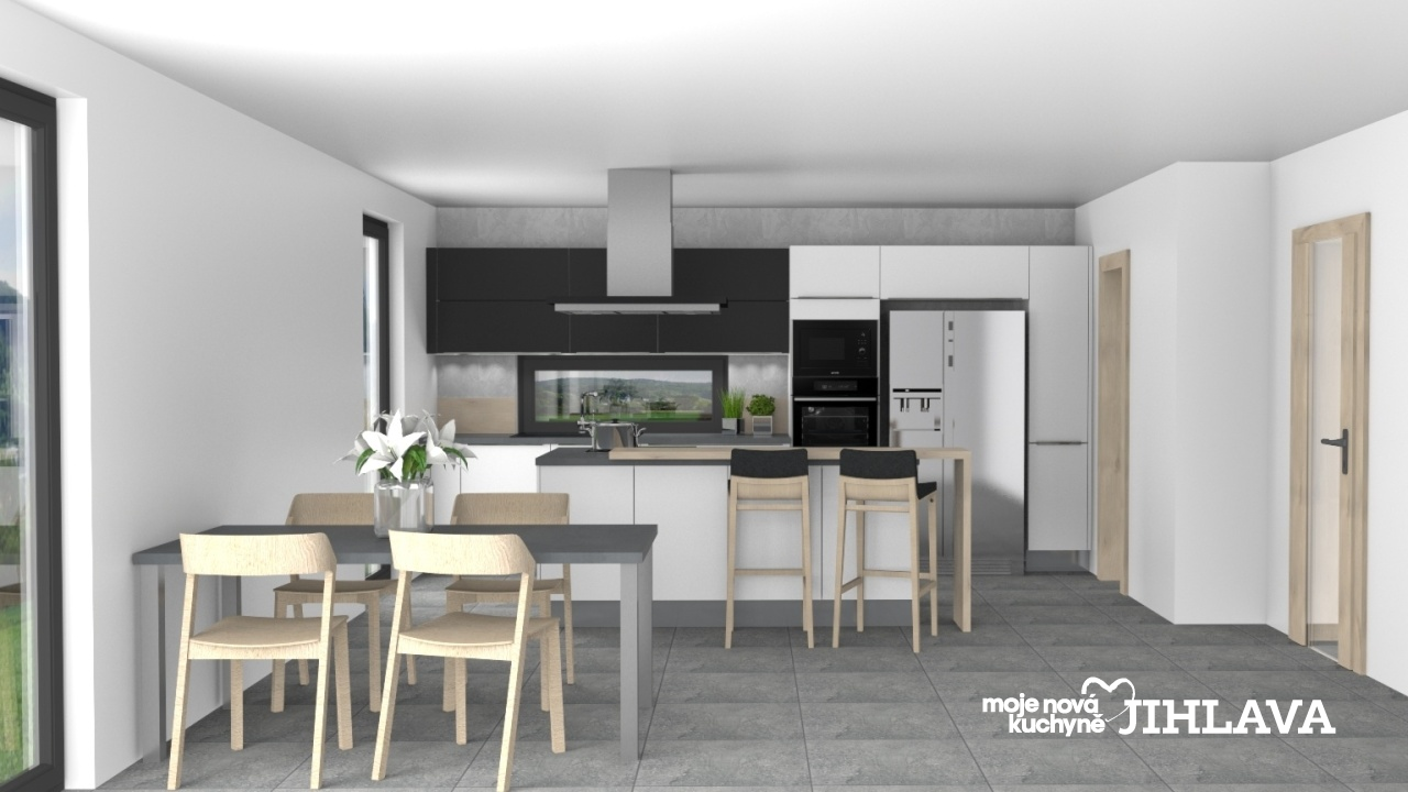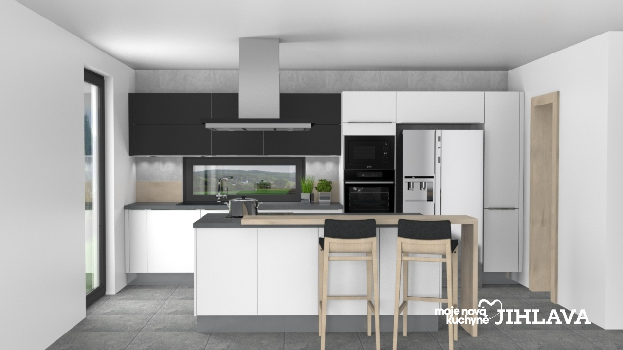 Rodinný dům se bude teprve stavět, designérka proto měla ohledně dispozice a umístění oken do kuchyně volnou ruku. Návrh je vymyšlen tak, aby vše bylo funkční, ergonomické a zároveň vypadalo krásně. Základní zadání: prostorná kuchyň a vaření na ostrůvku. Moderní kuchyně, model Ella, bílo – černá matná barva s doplňky ze světlého dřeva k proteplení prostoru. Velikost místnosti kuchyně dovoluje realizaci ostrůvku se zajímavým barovým pultem na přisednutí. Úchytka byla zvolena nasazená, nikde neruší a je praktická na údržbu.