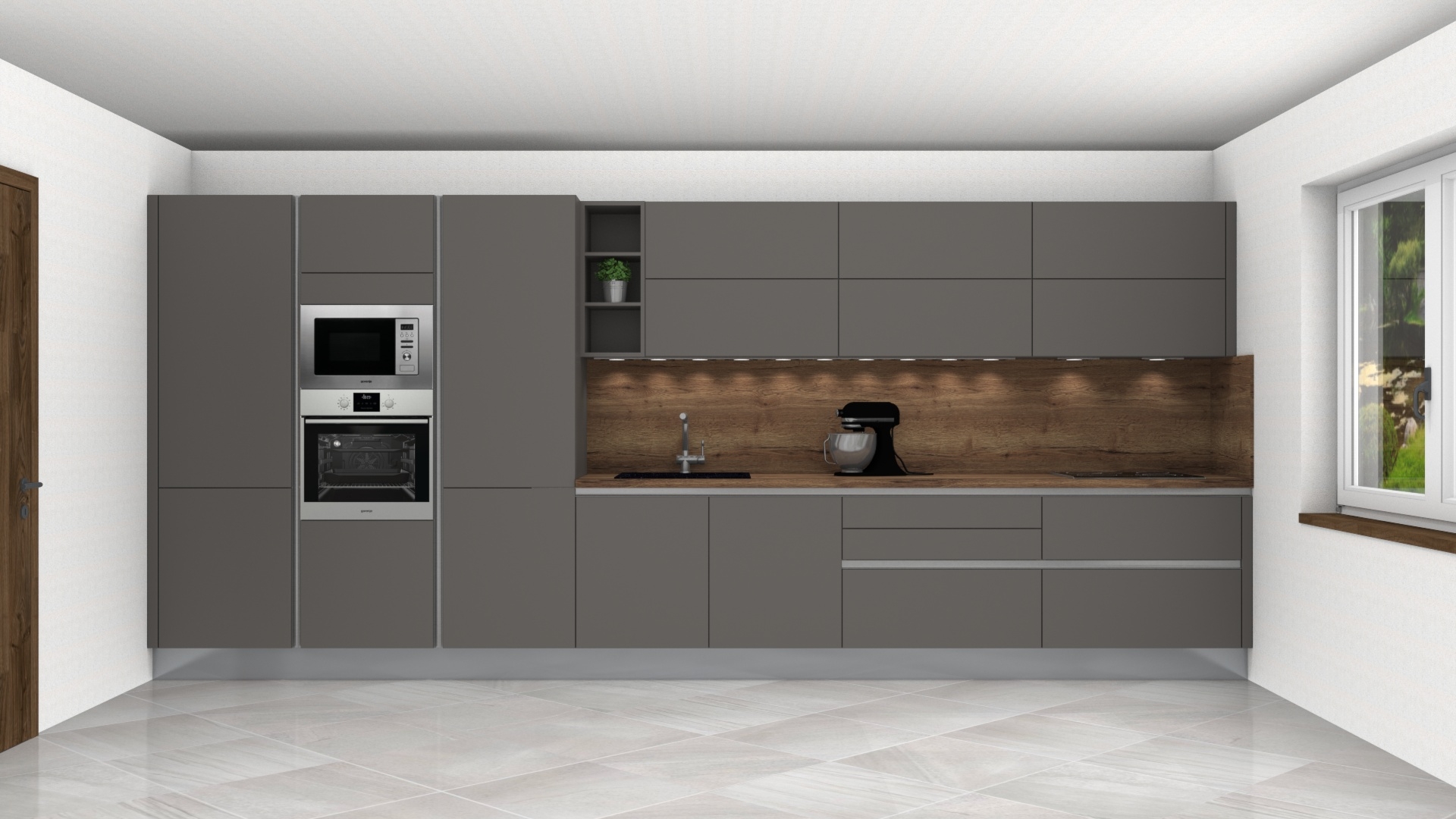 Cindy křemen šedý v hedvábně matném laminátu doplněná dřevodekorem v imitaci ořešáku na pracovní desce a zádovém obkladu.