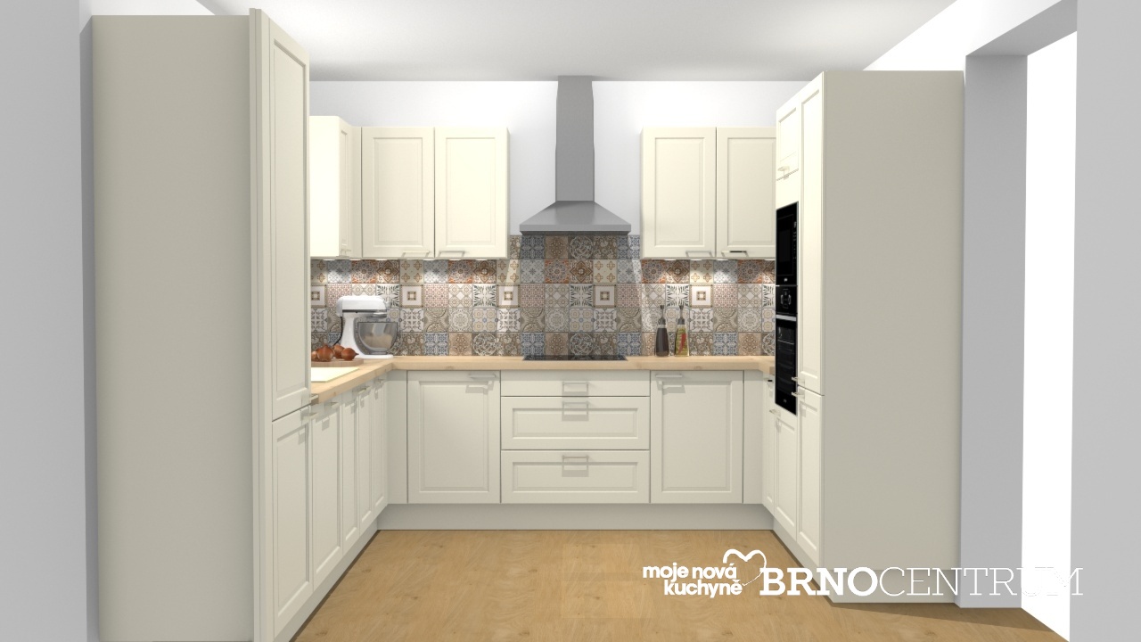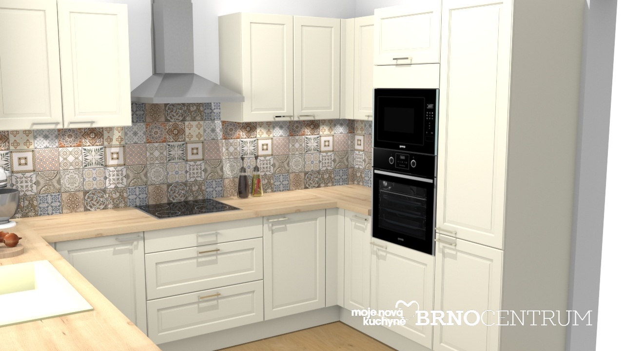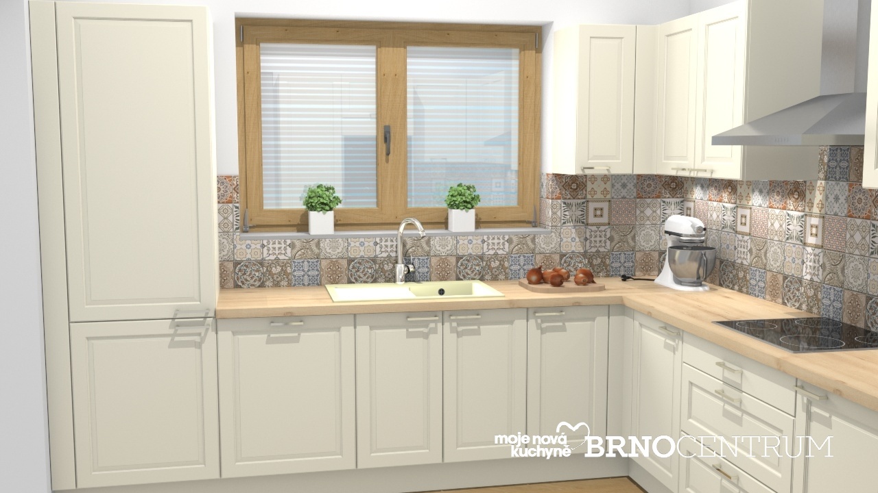 Jako obklad jsou naplánovány retro kachličky v dekoru patchwork, které se k rustikální kuchyni skvěle hodí a jsou teď velmi oblíbené.