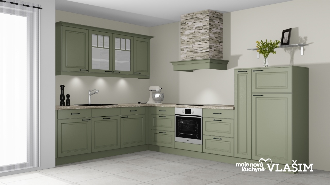 Oblíbená rustikální kuchyně Mara v barvě šalvěj, světle zelené v kombinaci s pracovní deskou v dekoru žíhaného kamene.