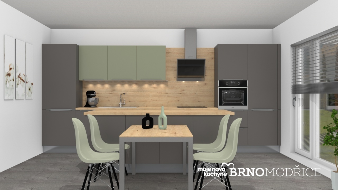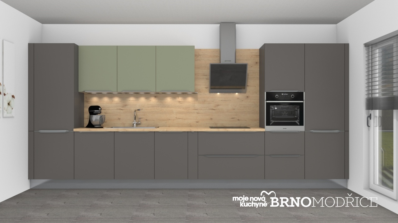 Horní skříně jsou v klasickém otevírání ve šalvějové barvě.