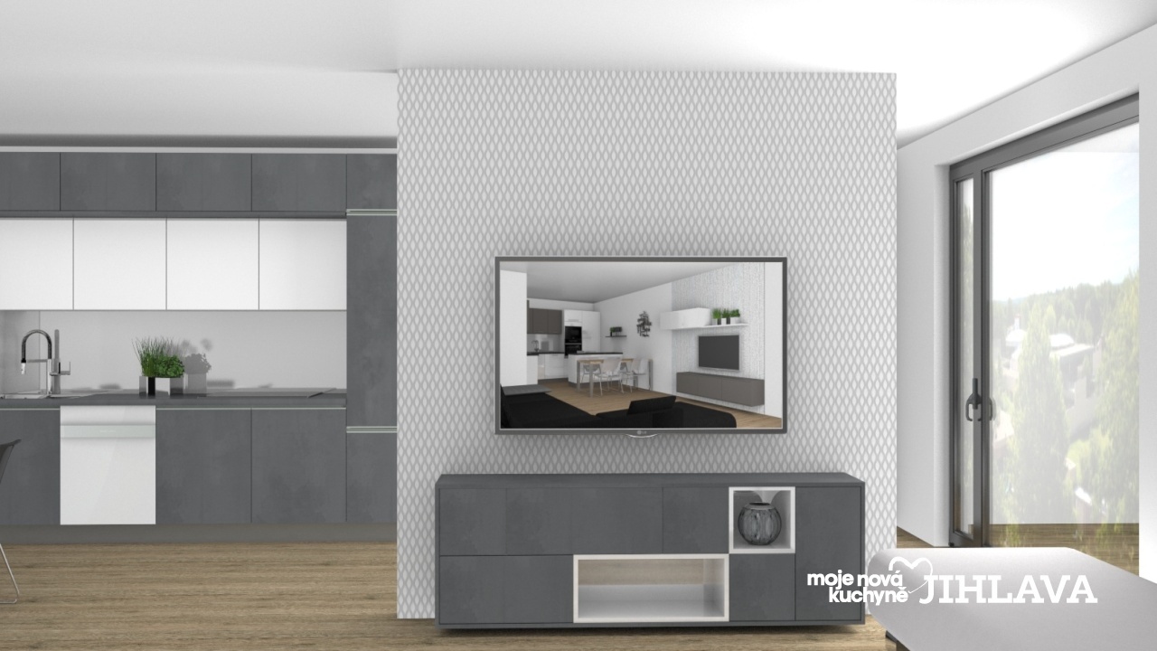Jednoduchá volně stojící skříňka pod televizi v kombinaci Antracitové Celine s polárně bílou Susann v lesku, která je použitá na otevřené police.