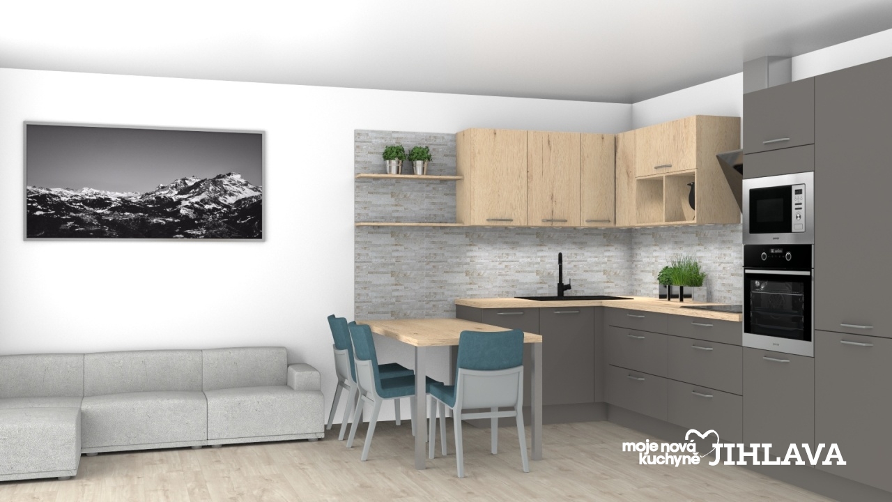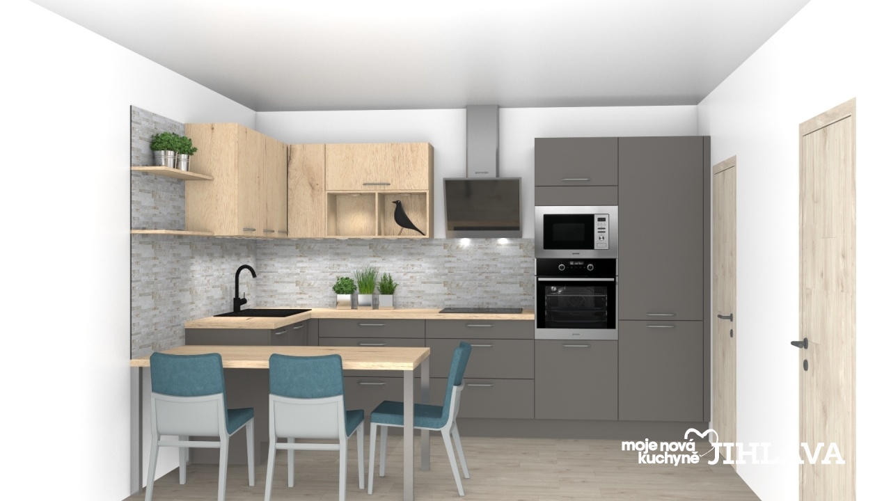 Kuchyně v moderní tmavé barvě quarz v hedvábně matném laminu v kombinaci se světlým dubem pískovým. Dub písek je použit i na pracovní a jídelní desku. Jako obklad je v kuchyni zvolený keramický obklad. Klasická úchytka v zaobleném provedení pomáhá k pohodlnému užívání kuchyně.
