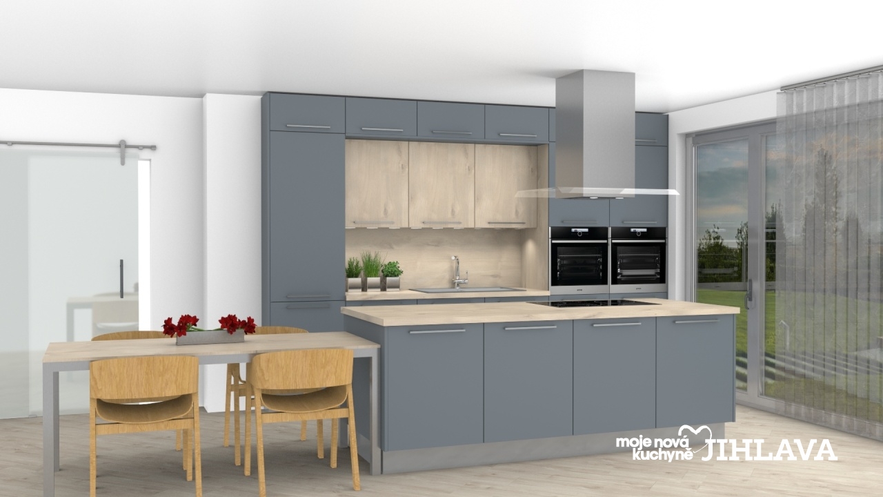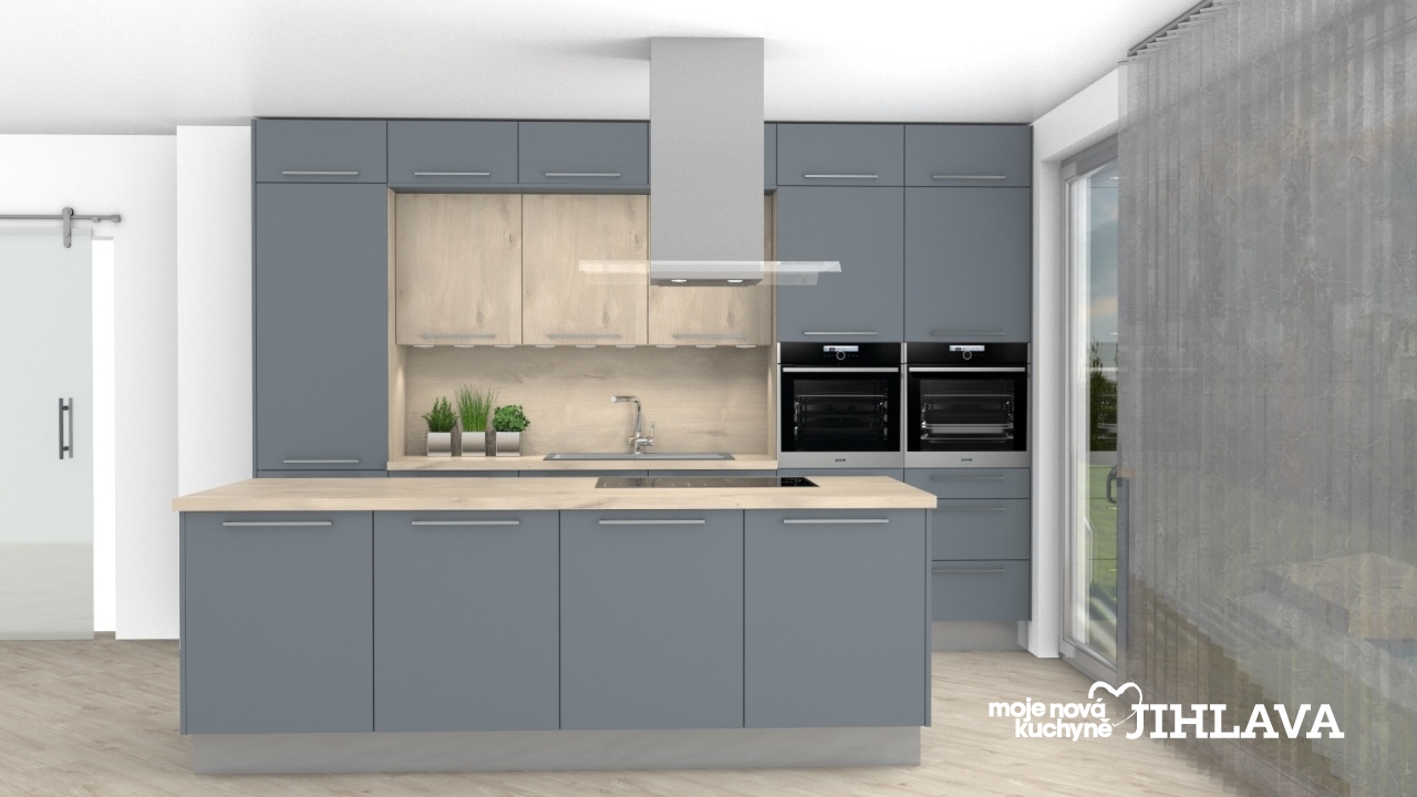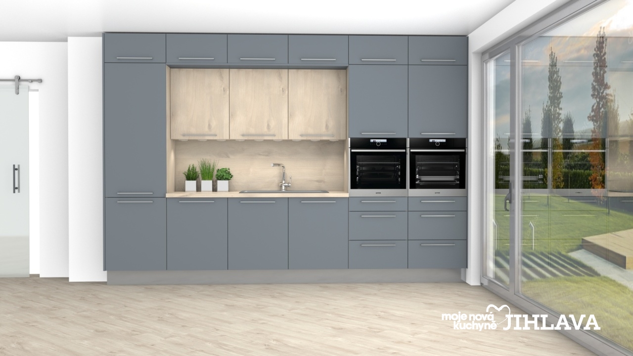 Hedvábně matná bouřkově šedá (šedomodrá) v kombinaci s jemným dřevodekorem Islandský javor. Kuchyně podle nejmodernějších trendů, kde jsou vysoké skříně v horní části propojeny a tvoří tak obestavbu horních skříní a díky tomu je kuchyně téměř až ke stropu. Kombinace šedomodré na naprosté většině skříní a světlého dřeva je jednoduchá, moderní i praktická. Pokud budete chtít, dá se doplňky kuchyně doladit do spousty stylů.