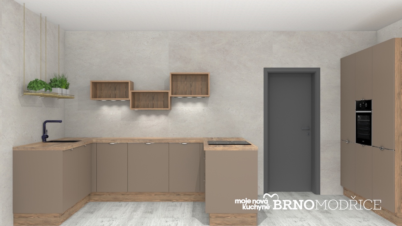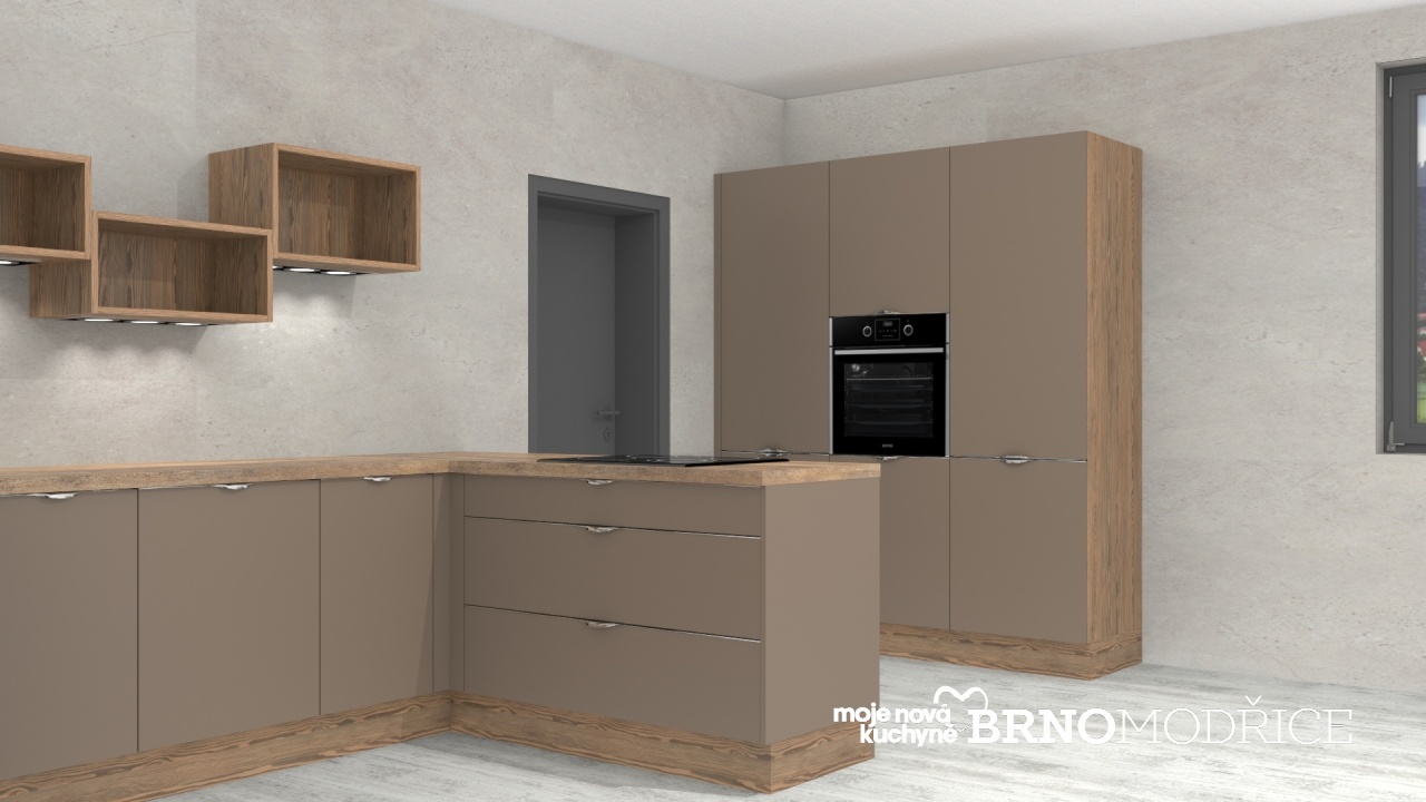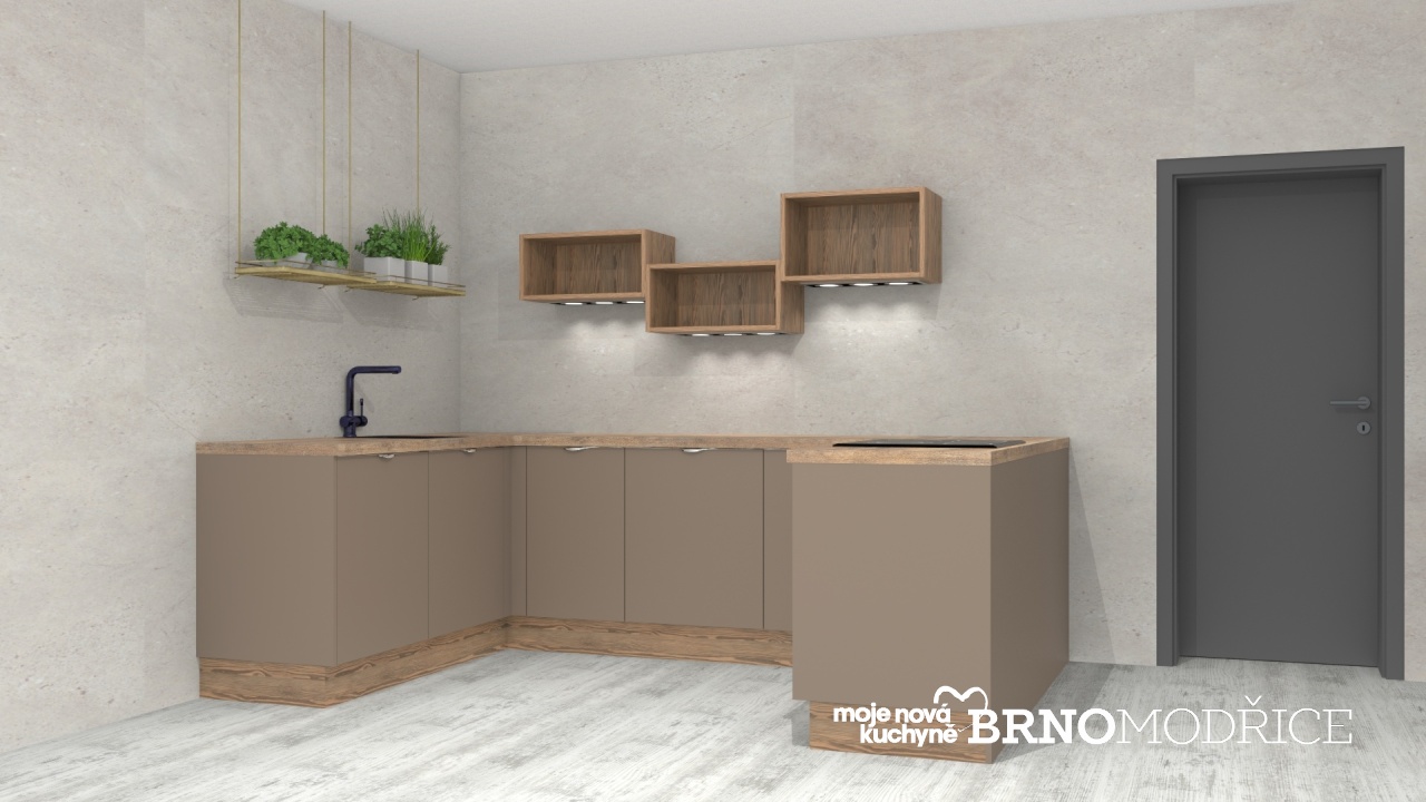Moderní super matná Maxima v odstínu Jíl v kombinaci s dřevodekorem Modřín Montana.