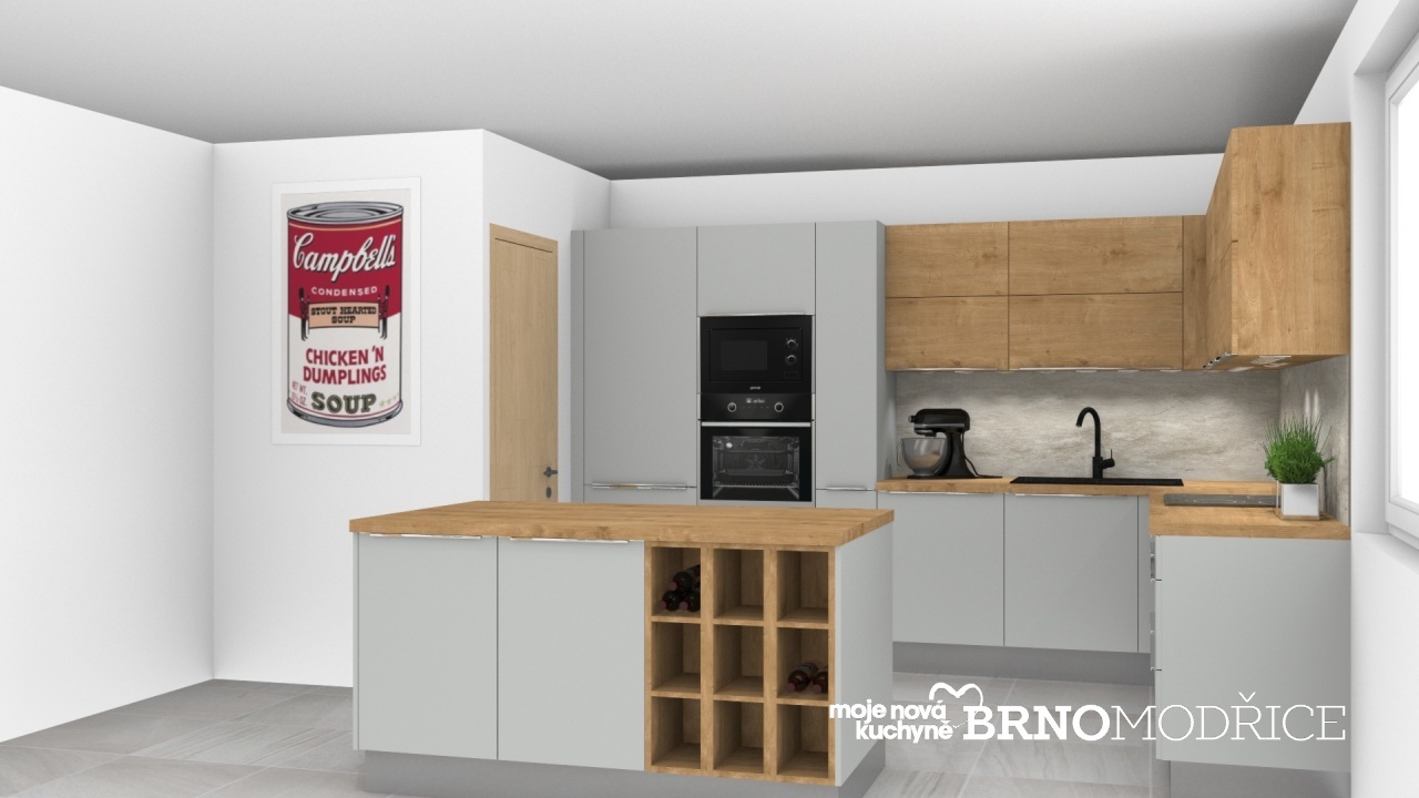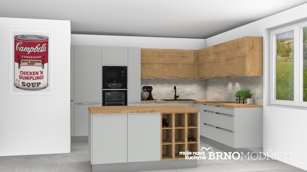 Dispozičně je kuchyně do tvaru L s ostrůvkem, který slouží jako pracovní plocha, úložný prostor a je v něm i vinotéka.