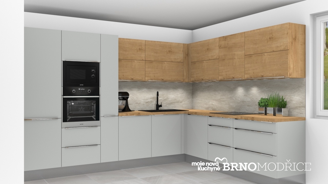Moderní Nella ve světle šedém laminátu v kombinaci s dřevodekorem Dub divoký.