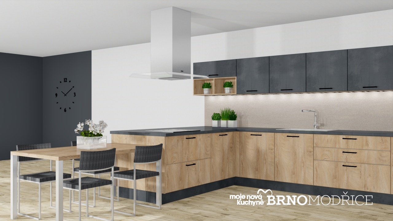 Dřevěná kuchyně Cora Grain Hell s betonem Celine v dekoru Antracitu s klasickou černou úchytkou.