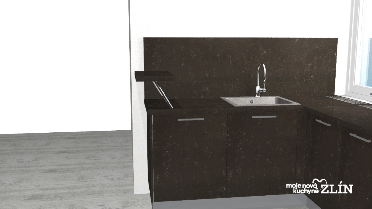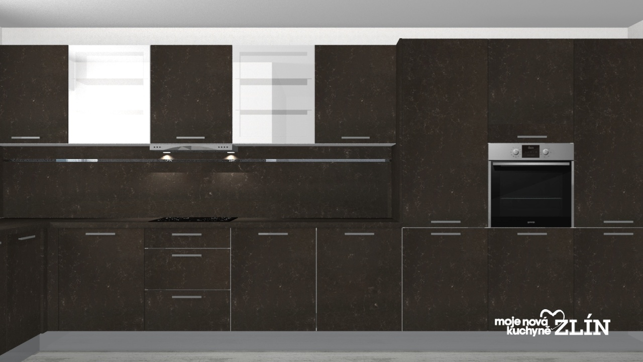 Moderní tmavá kuchyně Kira odstín Ceramica s chromovou úchytkou.