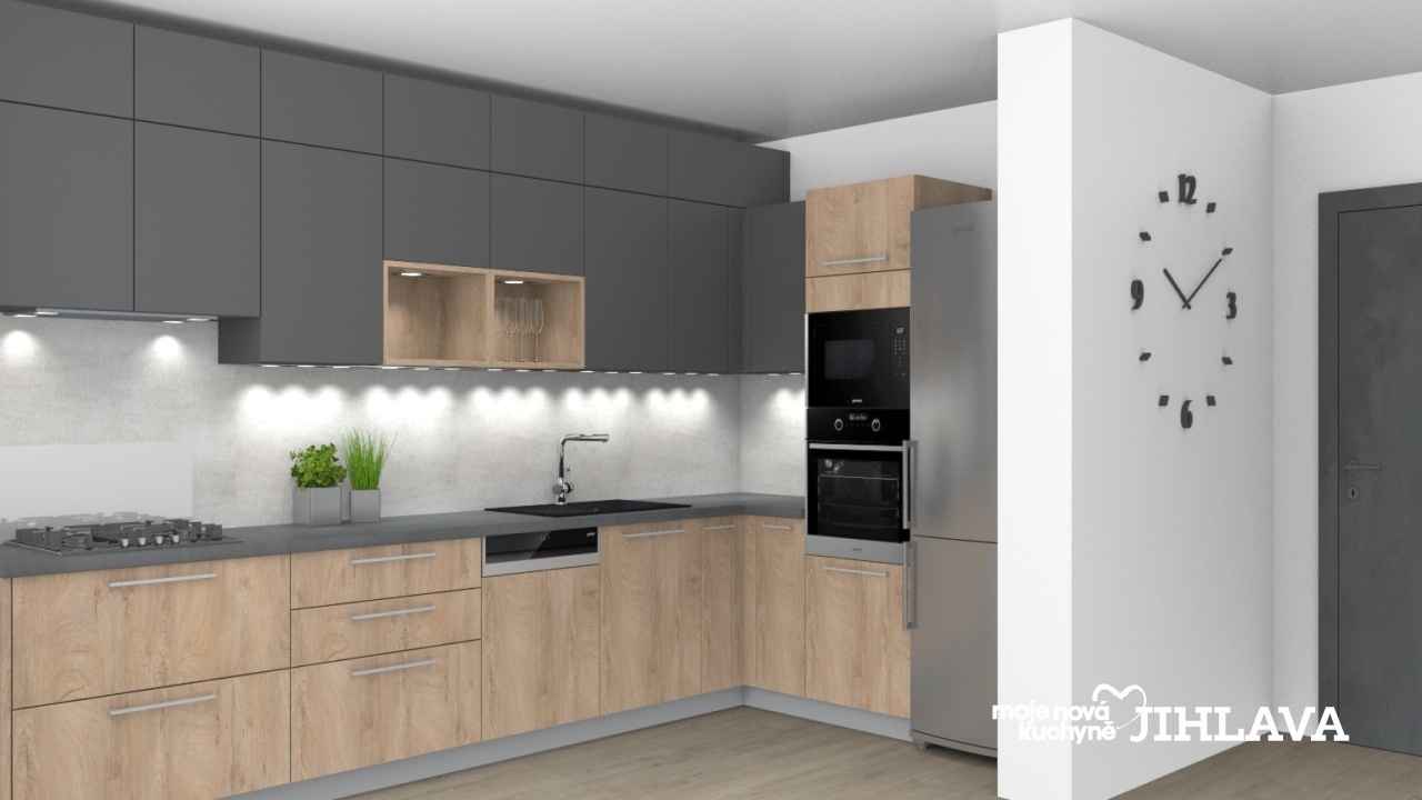 Pracovní deska je z dekoru Celine antracit, který se prolíná barevně s horními skříňkami.