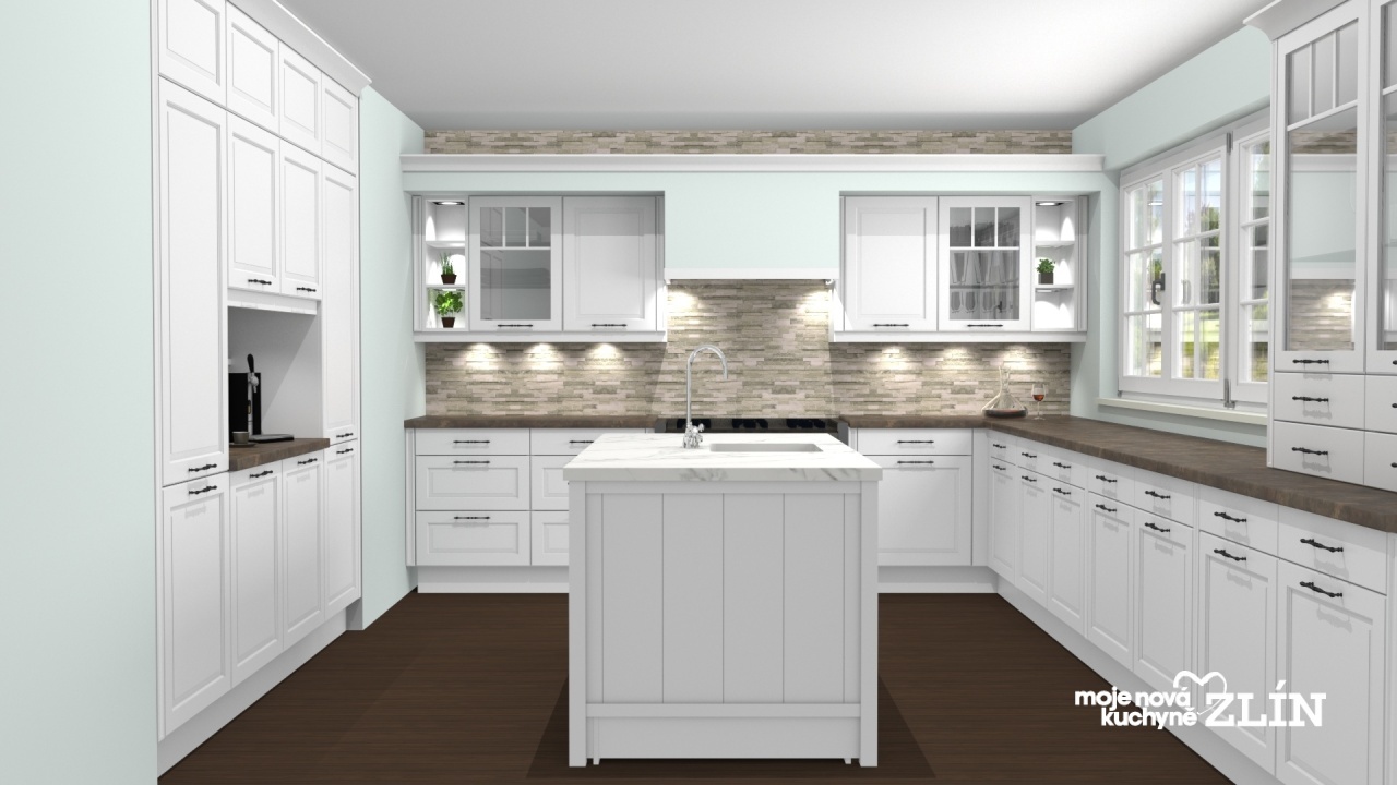 Celá kuchyně je lemovaná zdobnými věncovými a světelnými římsy.