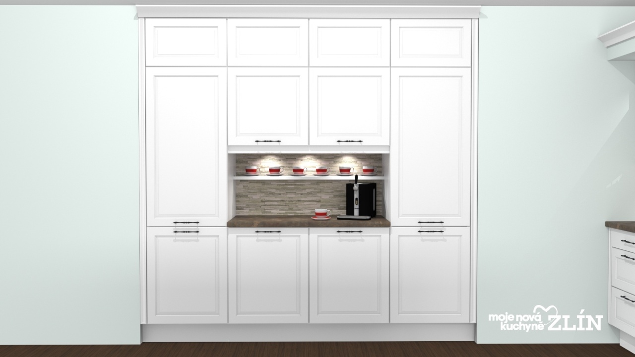 Zleva kuchyně začíná vysokými vestavnými skříněmi pro ledničku a spížní skříň se šuplíky. Prostor je obohacen otevřeným prostorem, který slouží jako kávový kout.
