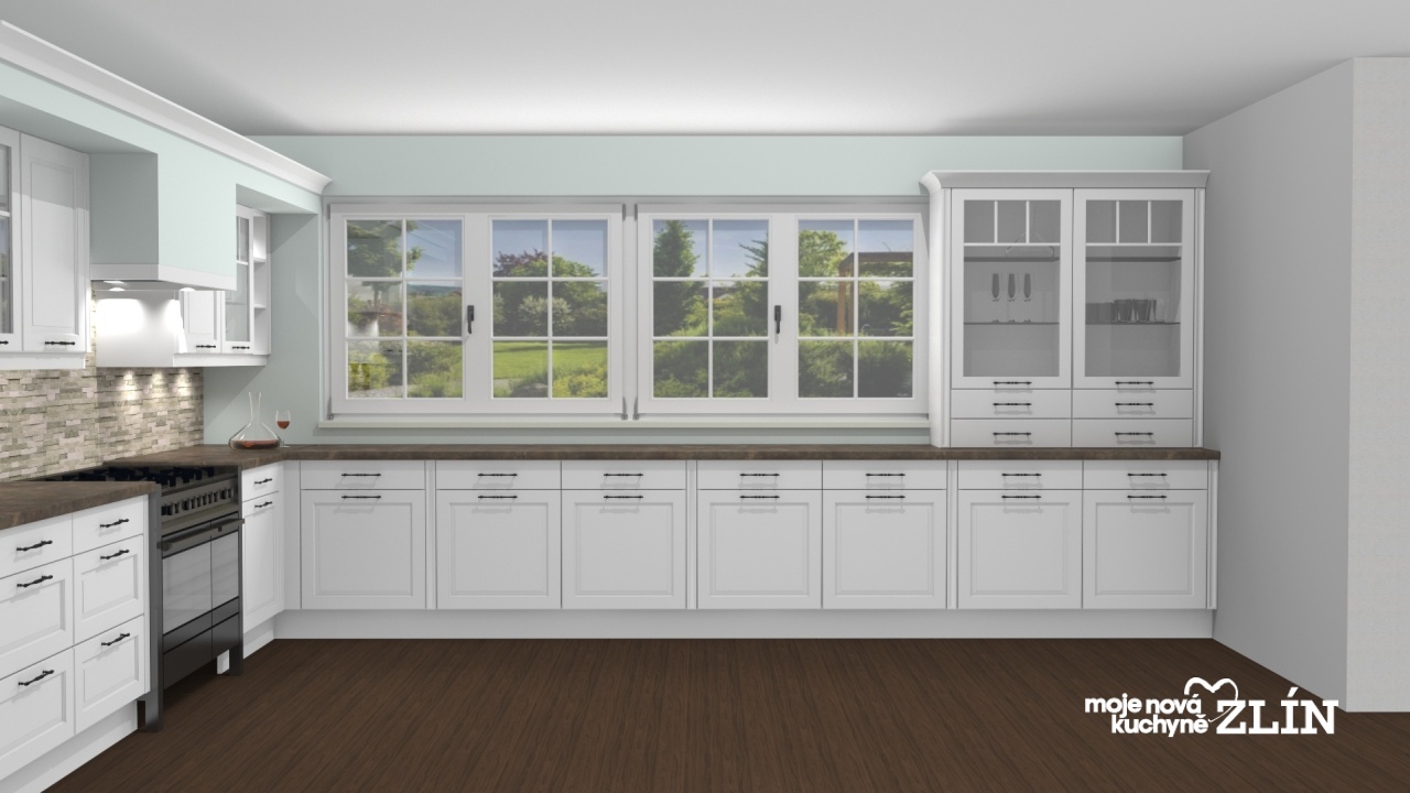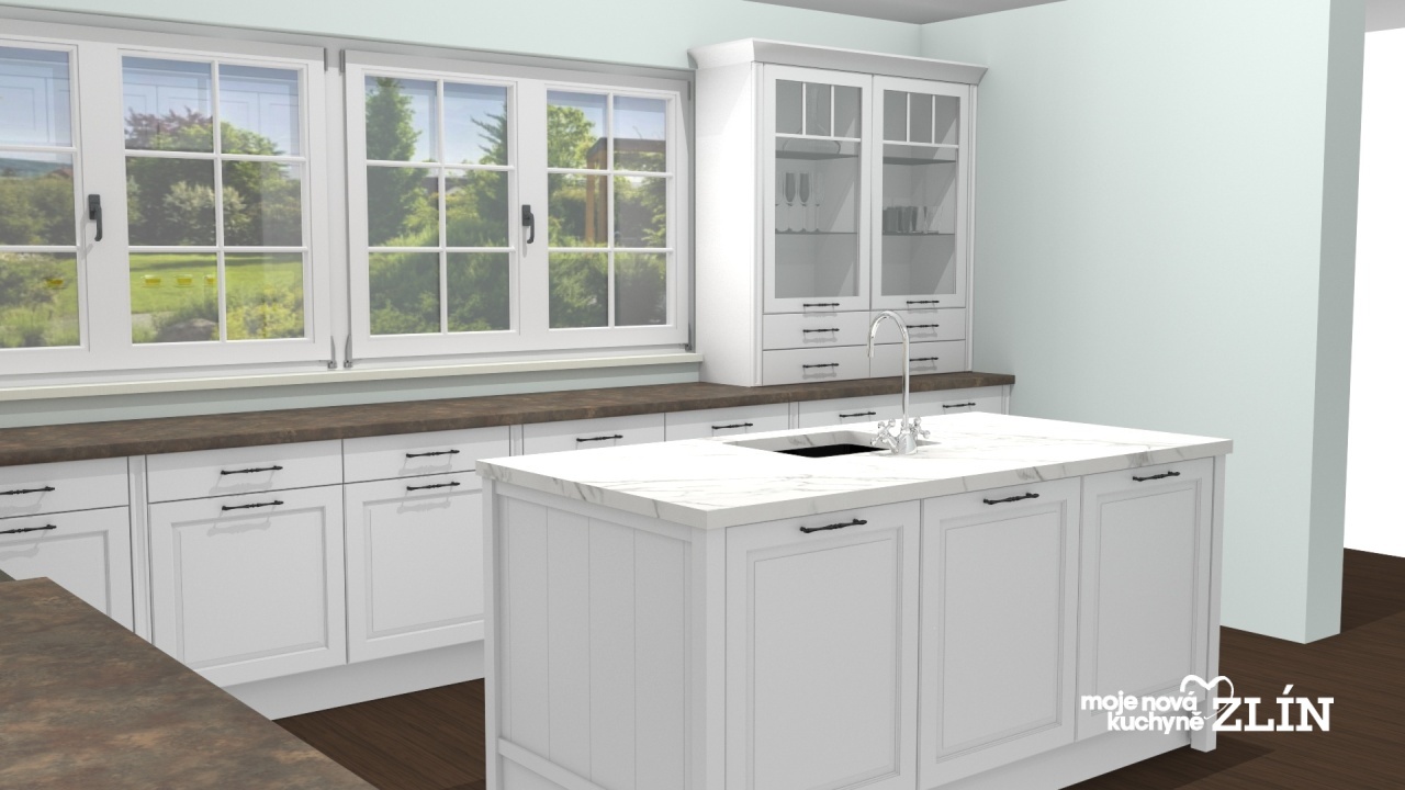 Tradiční kuchyně v anglickém romantickém stylu v dekoru Mara sametově bílá.